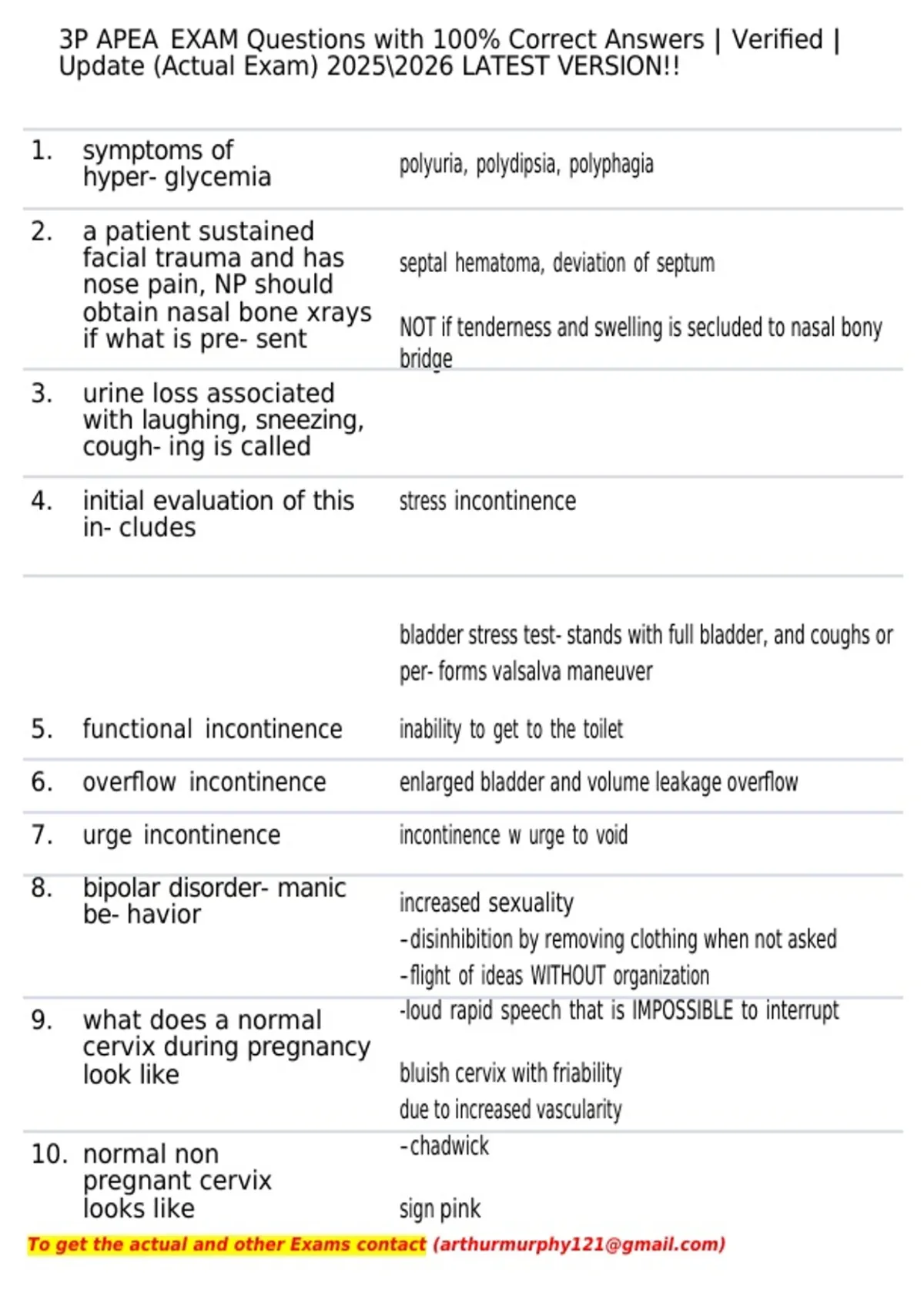 3P APEA EXAM Questions with 100% Correct Answers | Verified | Updated (Actual Exam) LATEST VERSION!! 1. symptoms of hyper glycemia polyuria, polydipsia, polyphagia 2. a patient sustained facial trauma and has nose pain, NP should obtain nasal bone xrays if what is pre sent septal hematoma, deviation of septum NOT if tenderness and swelling is secluded to nasal bony bridge 3. urine loss associated with laughing, sneezing, cough ing is called s