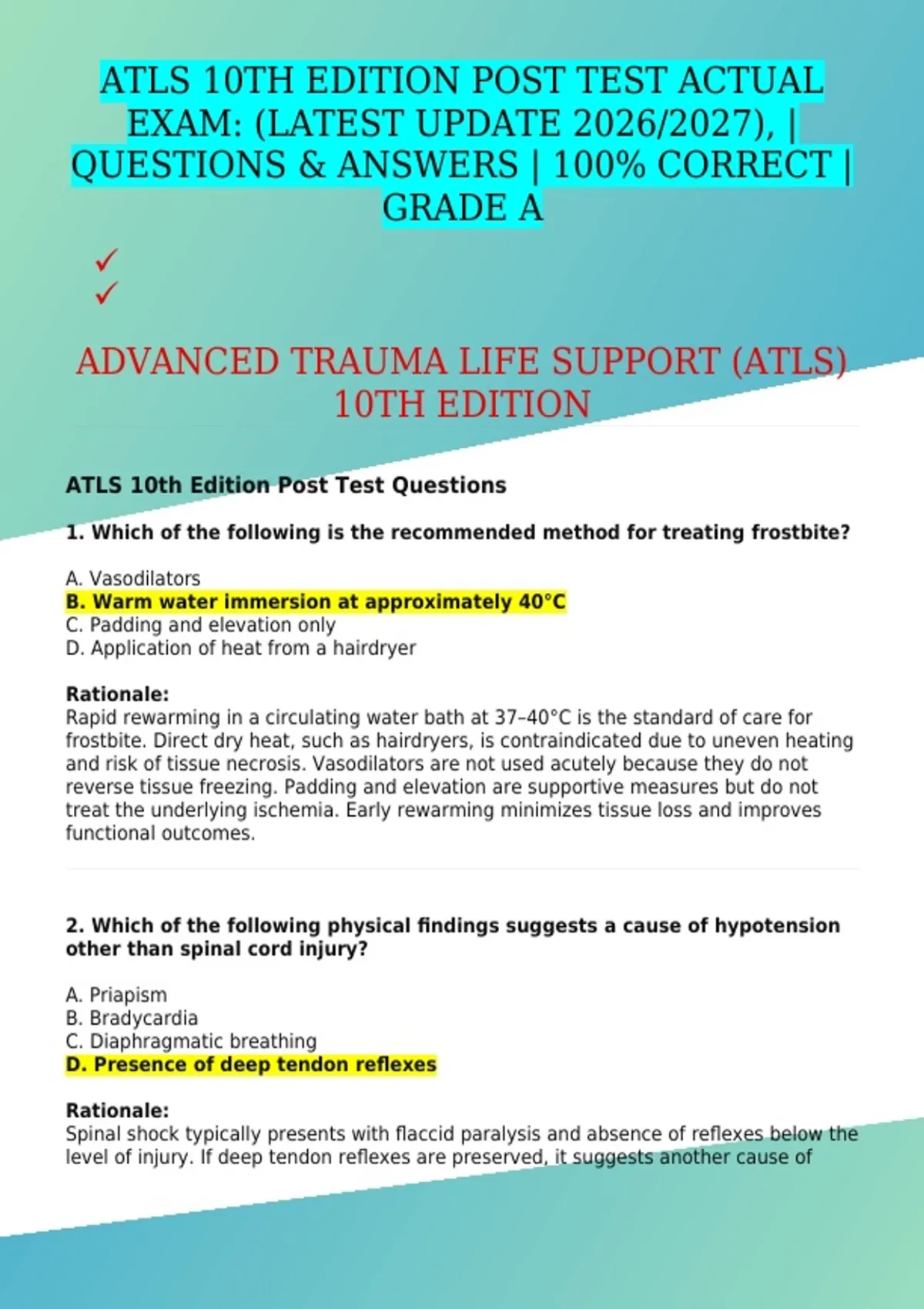 ATLS 10TH EDITION POST TEST ACTUAL EXAM: (LATEST UPDATE 2026/2027), | QUESTIONS & ANSWERS | 100% CORRECT | GRADE A