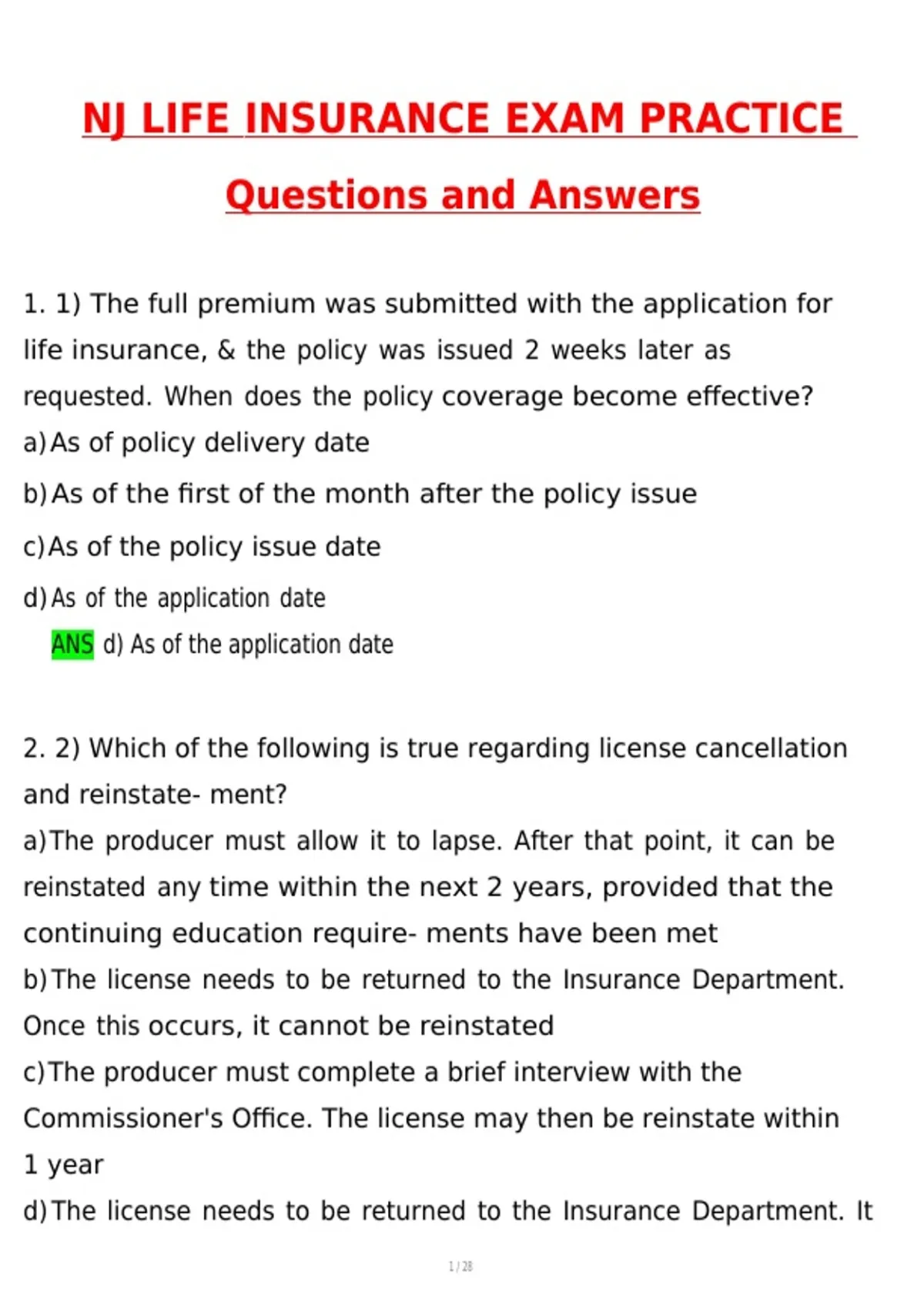 NJ LIFE INSURANCE EXAM PRACTICE