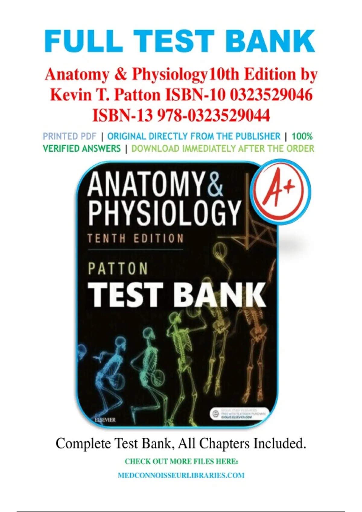 Test Bank for Anatomy & Physiology 10th Edition by Kevin T. Patton,0323529046, 9780323529044, All Chapters Covered 1-48, A+ guide. TEST BANK Table of Contents (Anatomy and Physiology 10th Edition Patton Test Bank) UNIT ONE: The Body as a Whole 1. Organization of the Body 2. Homeostasis 3. Chemical Basis of Life 4. Biomolecules 5. Cell Structure 6. Cell Function 7. Cell Growth and Development 8. Introduction to Tissues 9. Tissue Types UNIT TWO: Support and Movement 10. Skin 11. Skeletal Tissues 12. Axial Skeleton 13. Appendicular Skeleton 14. Articulations 15. Axial Muscles 16. Appendicular Muscles 17. Muscle Contraction UNIT THREE: Communication, Control, and Integration 18. Nervous System Cells 19. Nerve Signaling 20. Central Nervous System 21. Peripheral Nervous System 22. Autonomic Nervous System 23. General Senses 24. Special Senses 25. Endocrine Regulation 26 Endocrine Glands UNIT FOUR: Transportation and Defense 27. Blood 28. Heart 29. Blood Vessels 30. Circulation of Blood 31. Lymphatic System 32. Innate Immunity 33. Adaptive Immunity 34. Stress UNIT FIVE: Respiration, Nutrition and Excretion 35. Respiratory Tract 36. Ventilation 37. Gas Exchange and Transport 38. Upper Digestive Tract 39. Lower Digestive Tract 40. Digestion and Absorption 41. Nutrition and Metabolism 42. Urinary System 43. Fluid and Electrolyte Balance 44 Acid-Base Balance UNIT SIX: Reproduction and Development 45. Male Reproductive System 46. Female Reproductive System 47. Growth and Development 48. Genetics and Heredity