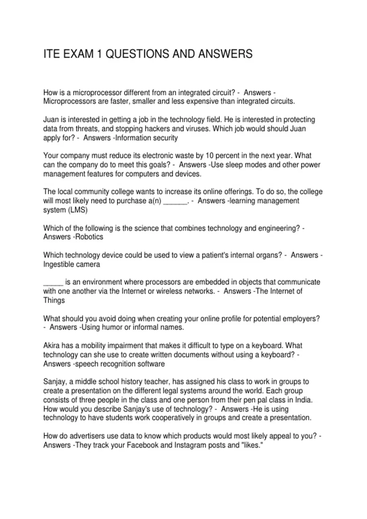 ITE EXAM 1 QUESTIONS AND ANSWERS