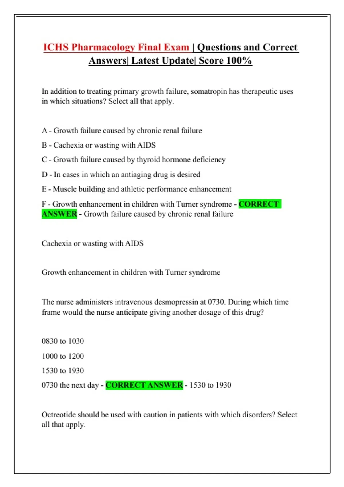ICHS Pharmacology Final Exam | Questions and Correct