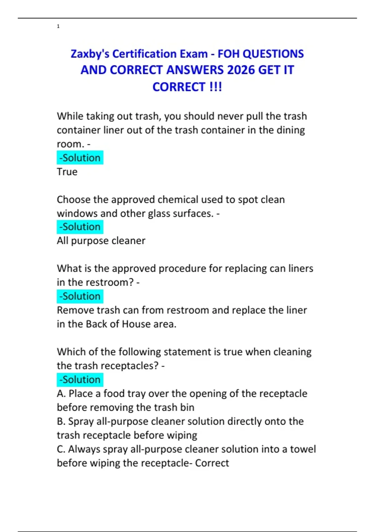 Zaxby's U Management Certification Exam, Zaxby's Certification Exam - FOH, Zaxby's Manager Certification Test ,Zaxby's Manager Certification Test Exam