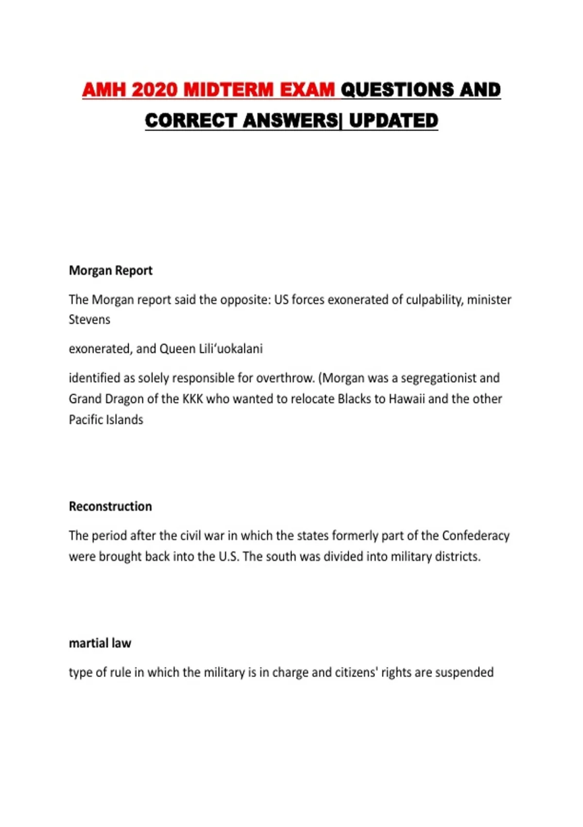 AMH 2020 MIDTERM EXAM QUESTIONS AND CORRECT ANSWERS| UPDATED