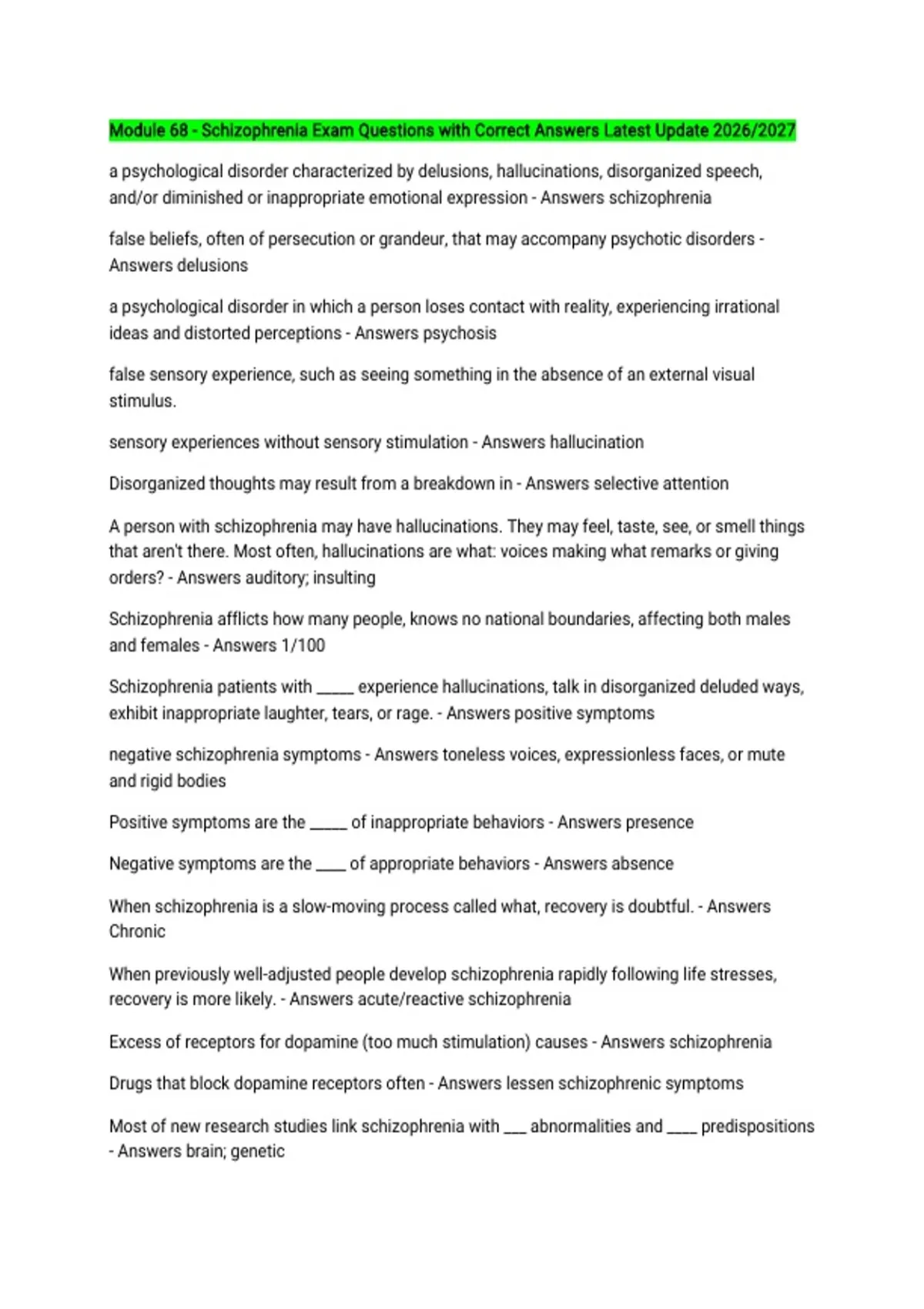 Module 68 - Schizophrenia Exam Questions with Correct Answers Latest Update 2026/2027