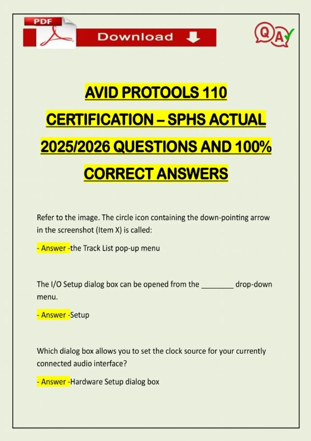 AVID PROTOOLS 110 CERTIFICATION – SPHS ACTUAL 2025/2026 QUESTIONS AND 100% CORRECT ANSWERS Refer to the image. The circle icon containing the down-pointing arrow in the screenshot (Item X) is called: - Answer -the Track List pop-up menu The I/O Setup dialog box can be opened from the ________ drop-down menu. - Answer -Setup Which dialog box allows you to set the clock source for your currently connected audio interface? - Answer -Hardware Setup dialog b