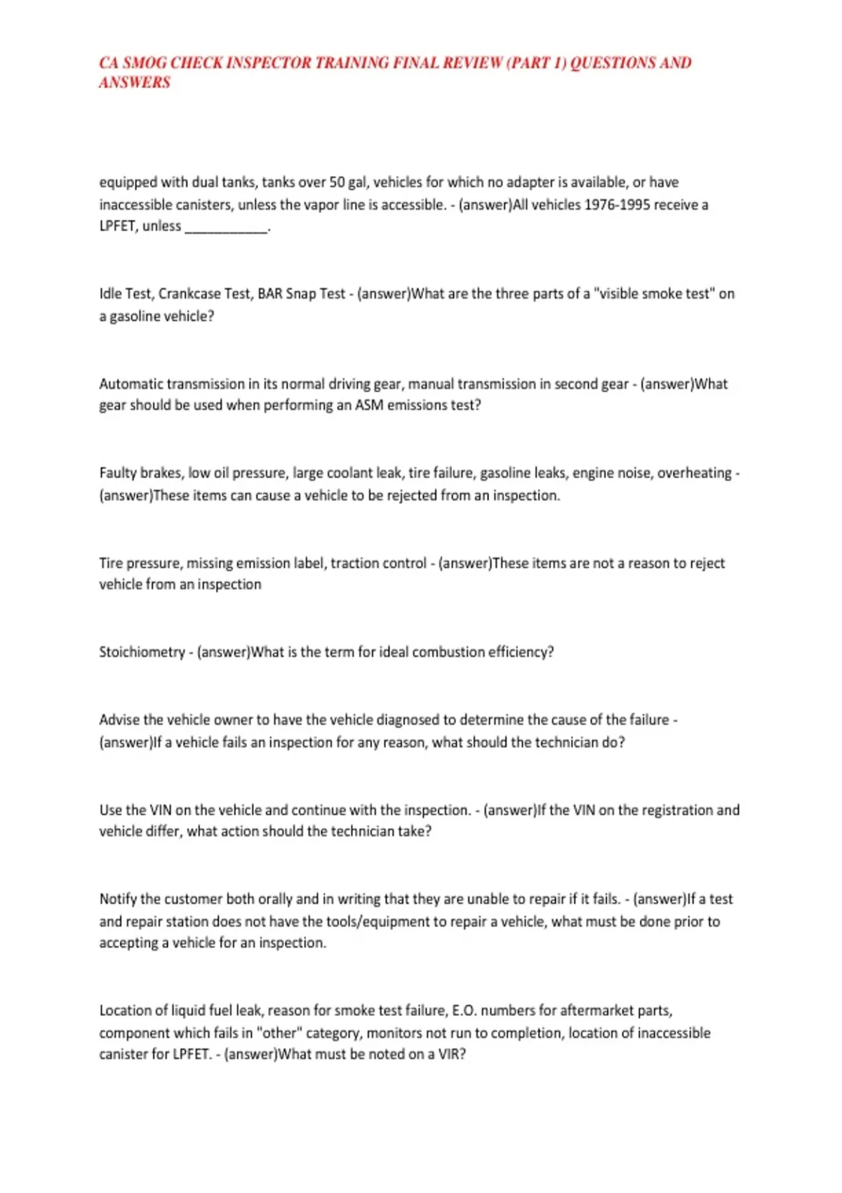 CA SMOG CHECK INSPECTOR TRAINING FINAL REVIEW (PART 1) QUESTIONS AND ANSWERS