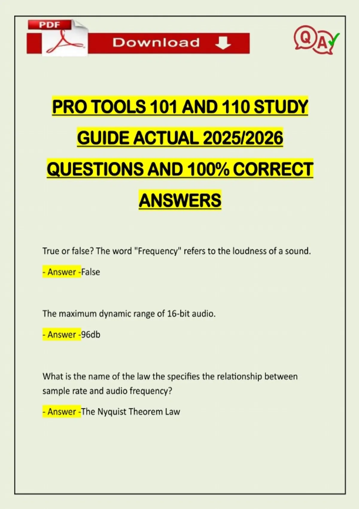 PRO TOOLS 101 AND 110 STUDY GUIDE ACTUAL 2025/2026 QUESTIONS AND 100% CORRECT ANSWERS True or false? The word "Frequency" refers to the loudness of a sound. - Answer -False The maximum dynamic range of 16-bit audio. - Answer -96db What is the name of the law the specifies the relationship between sample rate and audio frequency? - Answer -The Nyquist Theorem LawNeed assistance on Online classes, Exams & Assignments? Reach out for instant help!! Full Course Assistance, Plagiarism-free Essay Writing, Research Paper, Dissertation, Discussion Posts, etc…. Confidential & Secure services. Tutors are available for all subjects! Email now at: True or False? The session file (.ptx) is not stored along with the session folder when you create a new Pro Tools session. - Answer -False What type of processing does the Hard Ware Buffer Size affect? - Answer -Host based processing Which time-base do audio tracks use by default? - Answer -Samp