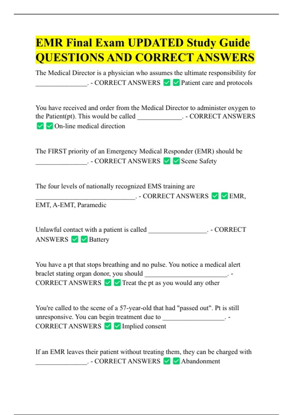 EMR Final Exam UPDATED Study Guide QUESTIONS AND CORRECT ANSWERS
