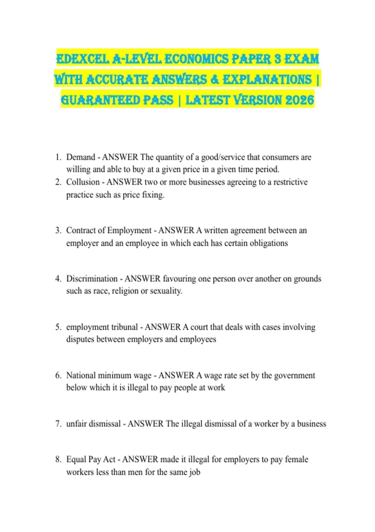 Edexcel A-level Economics Paper 3 Exam with Accurate Answers & Explanations | Guaranteed Pass | Latest Version 2026 1. Demand - ANSWER The quantity of a good/service that consumers are willing and able to buy at a given price in a given time period. 2. Collusion - ANSWER two or more businesses agreeing to a restrictive practice such as price fixing. 3. Contract of Employment - ANSWER A written agreement between an employer and an employee in which each has certain obligations 4. Discrimination - ANSWER favouring one person over another on grounds such as race, religion or sexuality. 5. employment tribunal - ANSWER A court that deals with cases involving disputes between employers and employees 6. National minimum wage - ANSWER A wage rate set by the government below which it is illegal to pay people at work 7. unfair dismissal - ANSWER The illegal dismissal of a worker by a business 8. Equal Pay Act - ANSWER made it illegal for employers to pay female workers less than men for the same job 9. Colluding - ANSWER In business, where several businesses (or countries) make agreements among themselves which benefit them at the expense of either rival businesses or customers 10. Market Structures - ANSWER The characteristics of a market, such as the size of the barriers to entry to the market, the number of businesses in the market or whether they produce identical products, which determine the behaviour of businesses within the market 11. Niche Market - ANSWER A smaller part of a larger market in which customers have more specific needs and wants 12. Mass Market - ANSWER all possible customers in a market, regardless of the differences in their specific needs and wants 13. Investment Appraisal - ANSWER The evaluation of an investment project to determine whether or not it is likely to be worthwhile 14. Average Rate of Return (ARR) - ANSWER Measures the annual net return on an investment as a percentage of its initial cost 15. Capital Cost - ANSWER The amount of money spent when setting up a new venture 16. Discounted Cash Flow (DCF) - ANSWER A method of investment appraisal that takes interest rates into account by calculating the present value of future income 17. Investment - ANSWER the purchase of new capital goods 18. Net Cash Flow - ANSWER cash inflows - cash outflows 19. Net Present Value (NPV) - ANSWER the sum of the present values of expected future cash flows from an investment, minus the cost of that investment 20. Payback Period - ANSWER the amount of time it takes to recover the initial investment of a business 21. Present Value - ANSWER The value today of a sum of money available in the future 22. Average Rate of Return Formula - ANSWER Net return (profit) per annum / Capital Outlay (cost) x 100 23. Ethical Considerations - ANSWER the social and environmental consequences of a financial decision 24. Risk - ANSWER Degree of uncertainty of return on an asset; in business, the likelihood of loss or reduced profit. 25. Shareholder - ANSWER A person who invests in a company by buying shares and is a partial owner 26. Dividend - ANSWER A financial reward paid out to shareholders for their investment in the company. It is often (but not always) paid annually and is taken from a small percentage of the company profits. 27. Stakeholder - ANSWER An individual, group, or organization who hold a perceived interest in the activities of a company e.g. local residents, governments or financial institutions. 28. External Stakeholders - ANSWER Groups outside a business with an interest in its activities e.g. local community 29. Internal Stakeholders - ANSWER Groups inside a business with an interest in its activities e.g. employees and managers 30. shareholder value - ANSWER A measure of company performance that combines the size of dividends with the share price 31. Stakeholder conflict - ANSWER When different stakeholder groups have different aims and objectives, which can be difficult for a business to satisfy at the same time. 32. Stakeholder Approach - ANSWER firms work to meet the demands of multiple stakeholders—employees, suppliers, and the community. 33. Shareholder Approach - ANSWER the firm exists to maximize the wealth of its owners e.g. shareholders 34. Protectionism - ANSWER the theory or practice of shielding a country's domestic industries from foreign competition by taxing imports. 35. Administrative barriers - ANSWER Rules and regulations (such as trading standards and strict specifications) that make it difficult for importers to penetrate an overseas market 36. Dumping - ANSWER Where an overseas firm sells large quantities of a product below cost in the domestic market 37. Embargo - ANSWER an official ban on trade or other commercial activity with a particular country. 38. Import Quota - ANSWER a limit on the number of products in certain categories that a nation can import infant industries - ANSWER those industries that are just getting started and have yet to establish themselves. They might require some form of protection. Subsidy - ANSWER Financial support given to a domestic producer to help compete with overseas firms Tariffs or Customs Duties - ANSWER A tax on imports to make them more expensive Trade Barriers - ANSWER Measures designed to restrict trade Free Trade - ANSWER the movement of goods and services among nations without political or economic barriers Globalisation - ANSWER The increasing integration of economies and societies around the world particularly through international trade Reshoring - ANSWER Bringing production back home after using foreign production facilities for a period of time