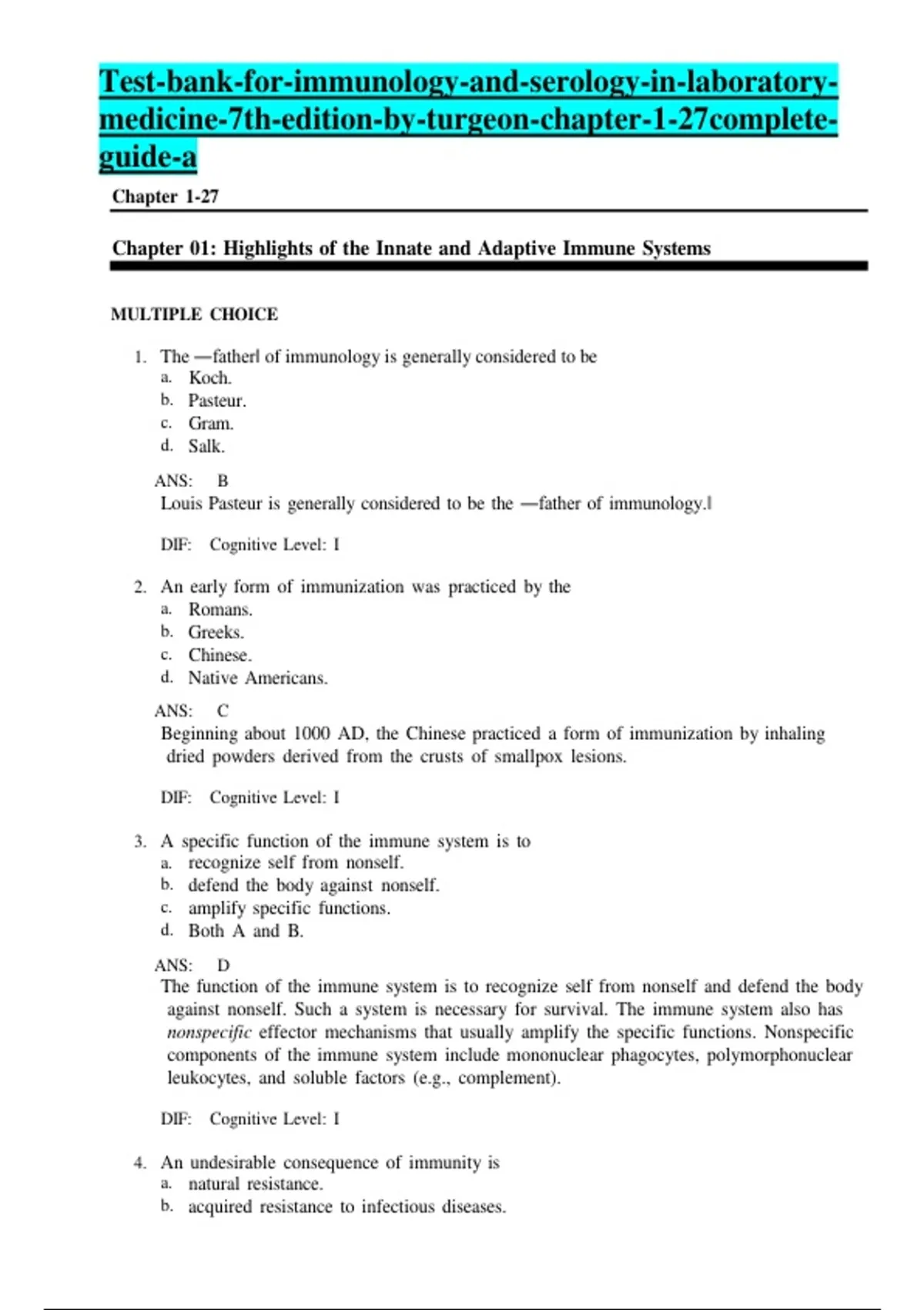 Chapter 01: Highlights of the Innate and Adaptive Immune Systems