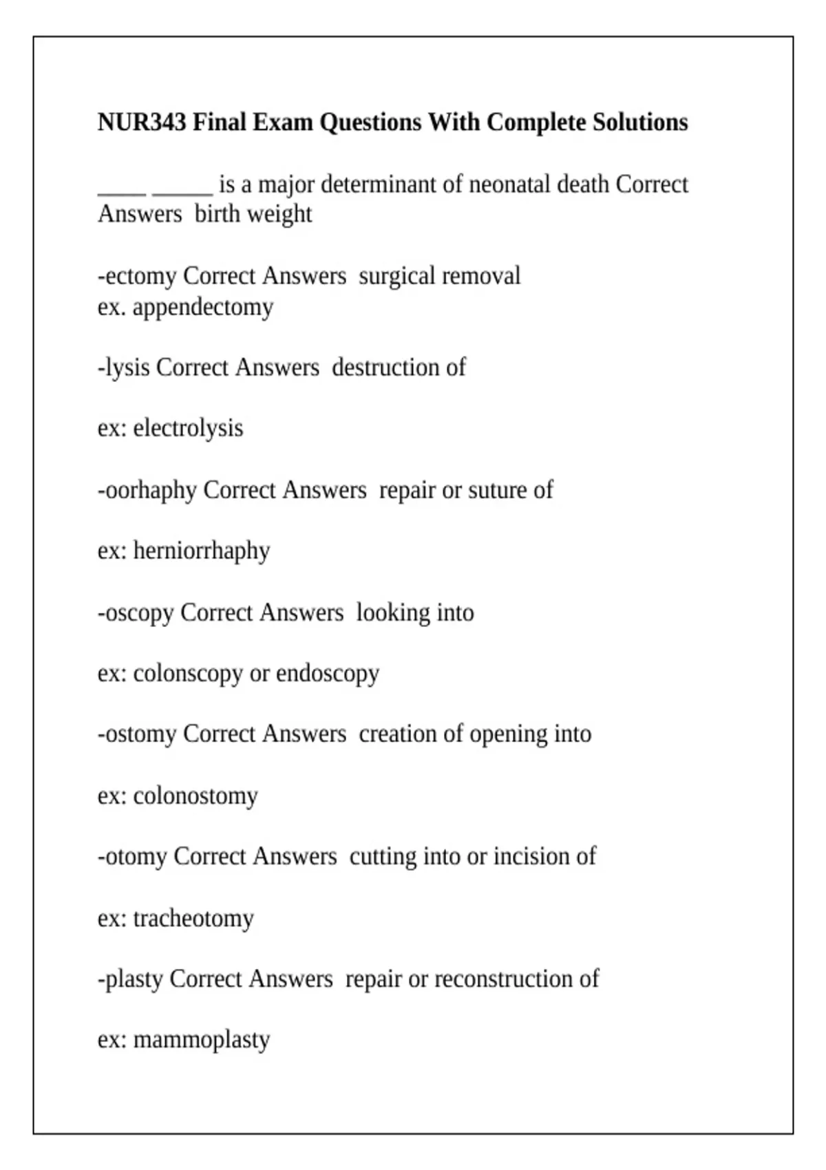 NUR343 Final Exam Questions With Complete Solutions