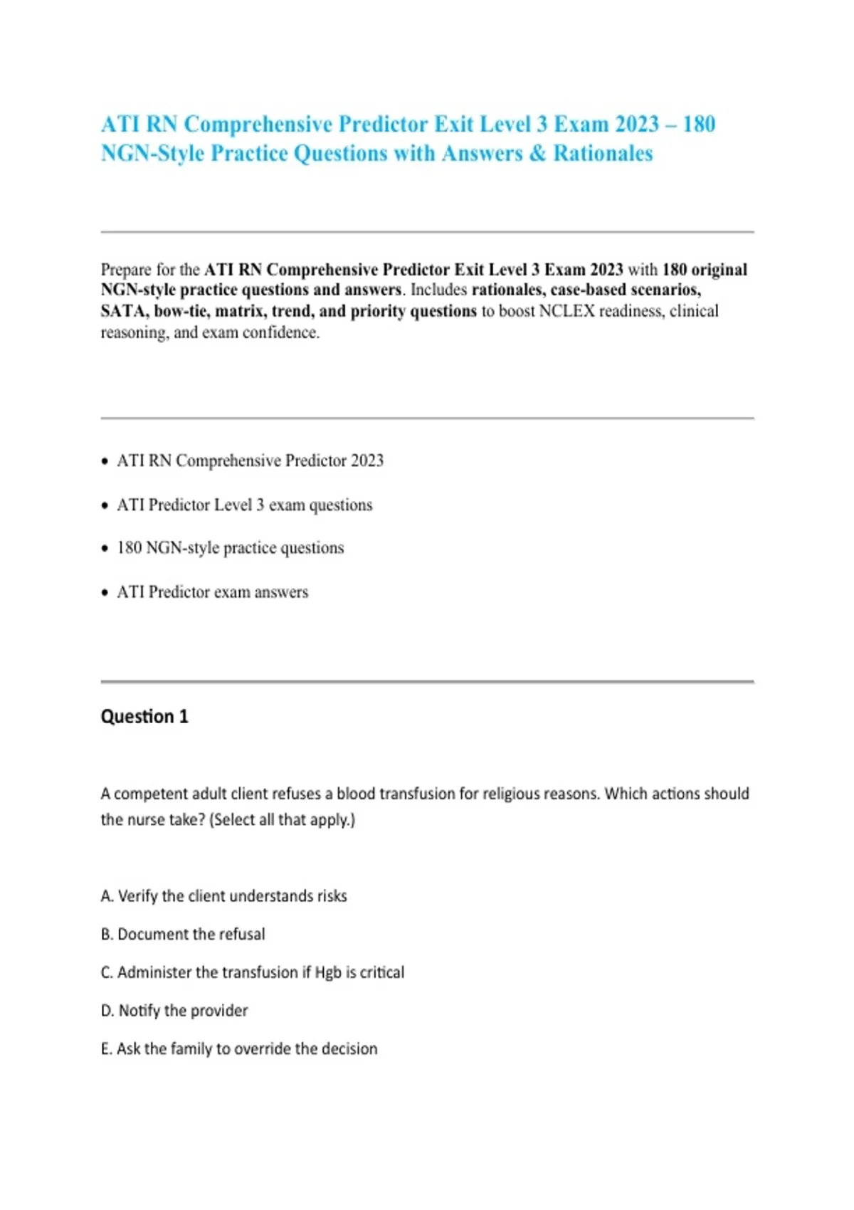 ATI RN Comprehensive Predictor Exit Level 3 Exam 2023 – 180 NGN-Style Practice Questions with Answers & Rationales