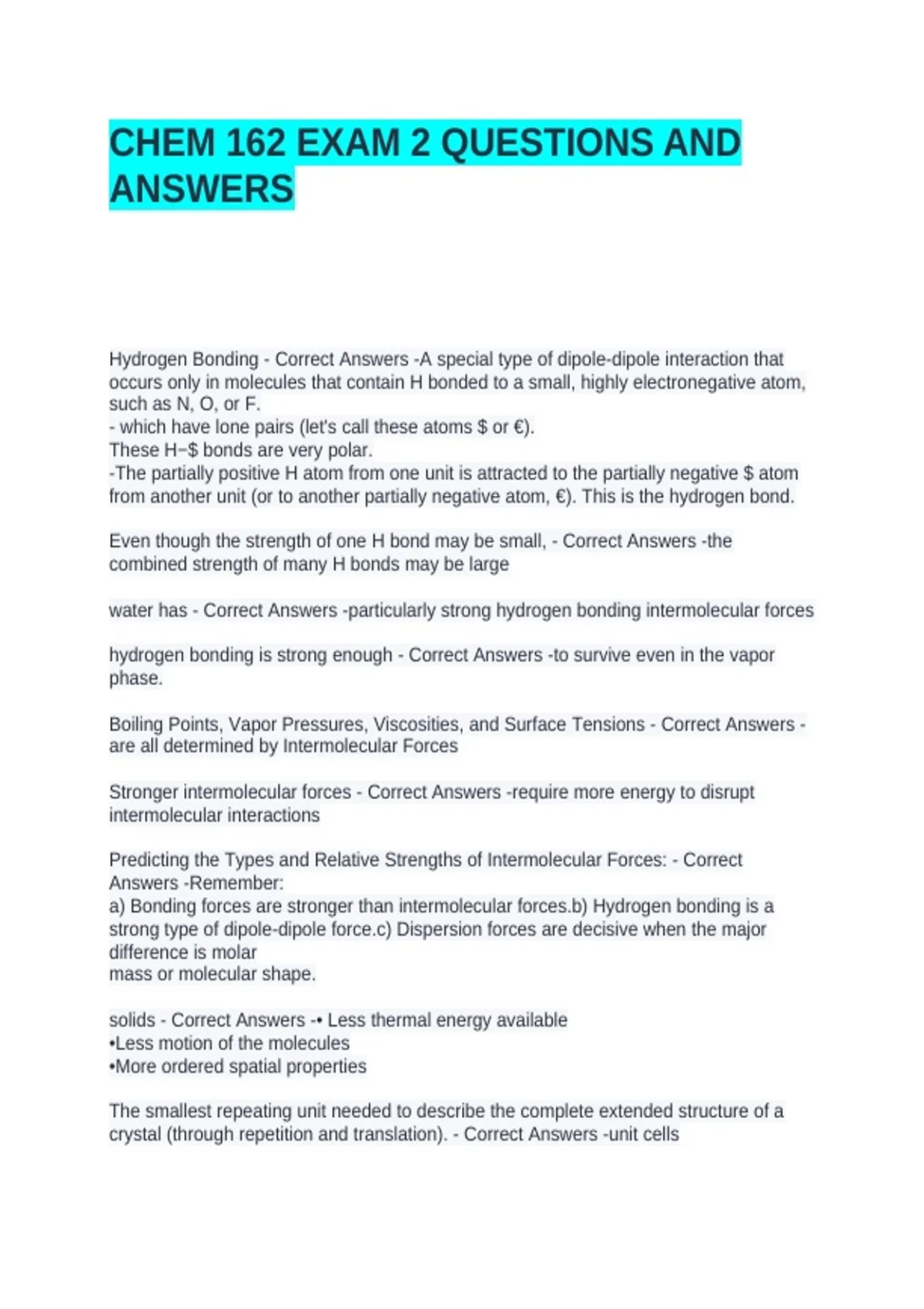 Hydrogen Bonding - Correct Answers -A special type of dipole-dipole interaction that
