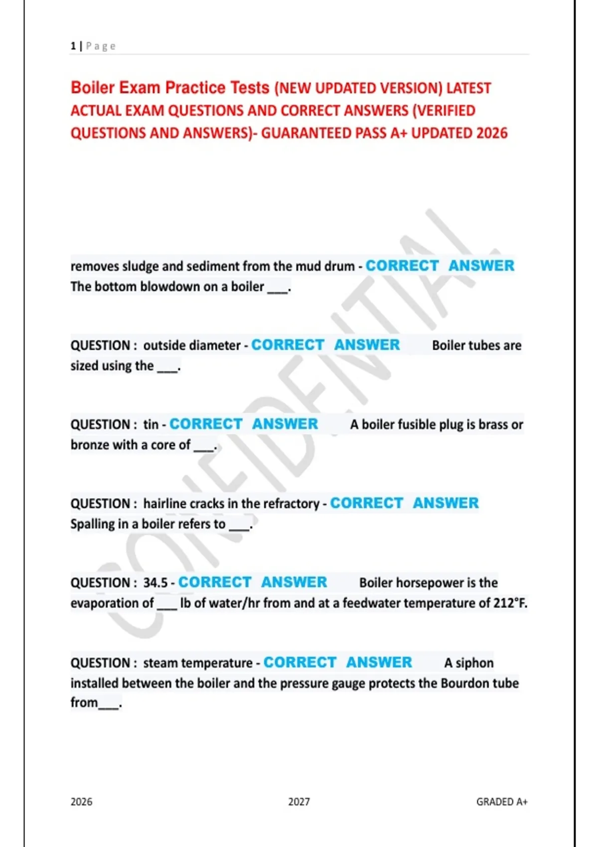 Prepare for boiler certification exams in 2026–2027 with a comprehensive study guide featuring practice questions, detailed answers, and rationales. Focus on boiler operation, thermodynamics, pressure systems, pumps, turbines, electrical systems, and safety protocols. Learn to interpret steam tables, control instruments, and apply safe operational procedures in boiler systems. Ideal for aspiring boiler operators and power engineering students seeking confidence and success on exams.
