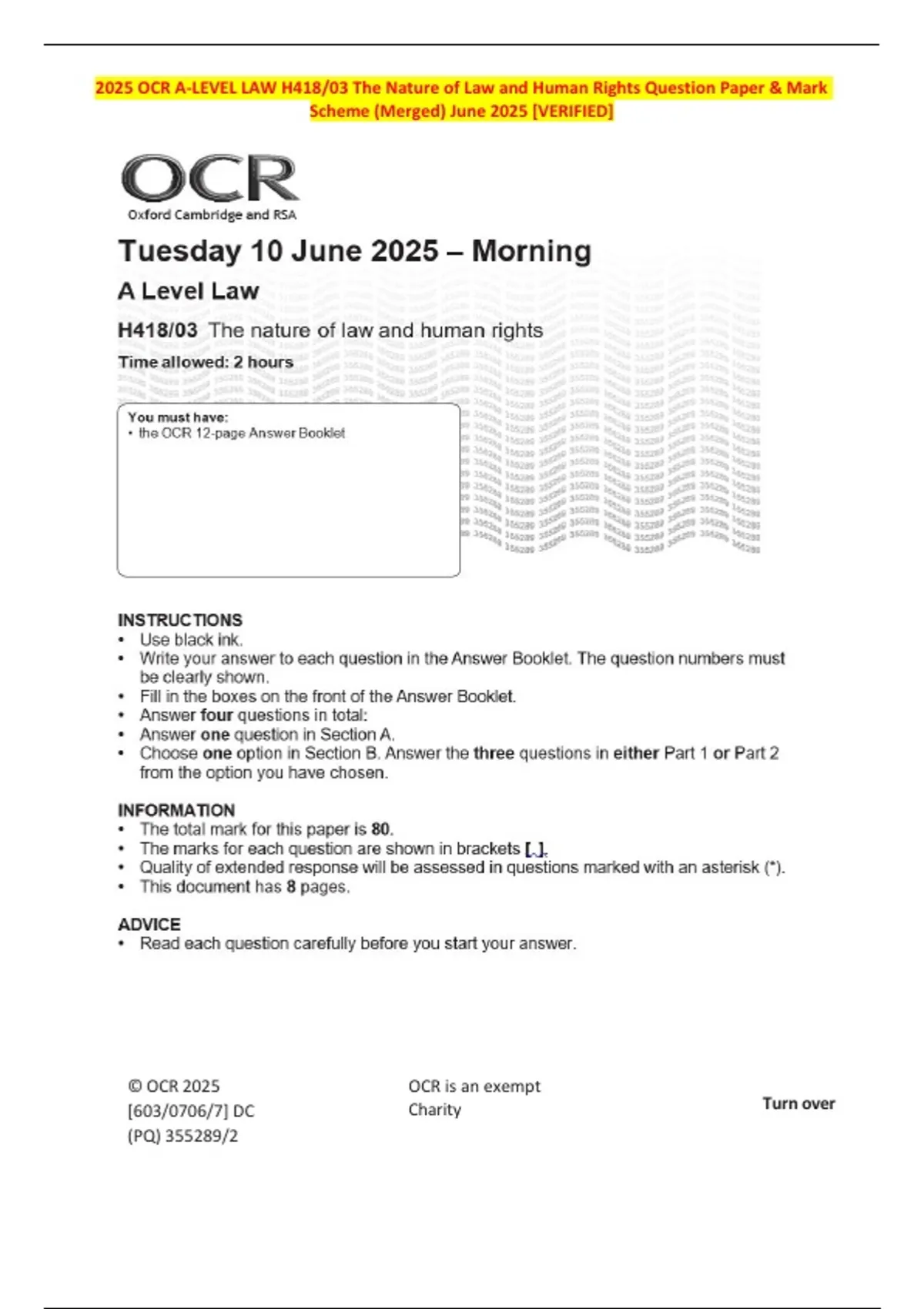 2025 OCR A-LEVEL LAW H418/03 The Nature of Law and Human Rights Question Paper & Mark Scheme (Merged) June 2025 [VERIFIED]