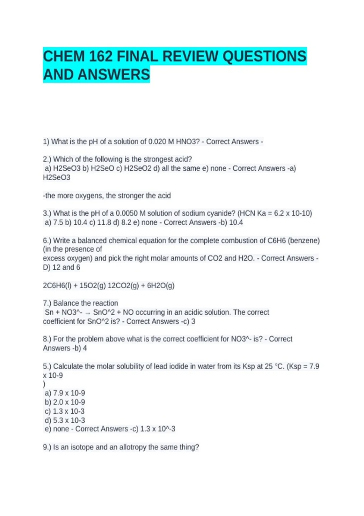 CHEM 162 FINAL REVIEW QUESTIONS