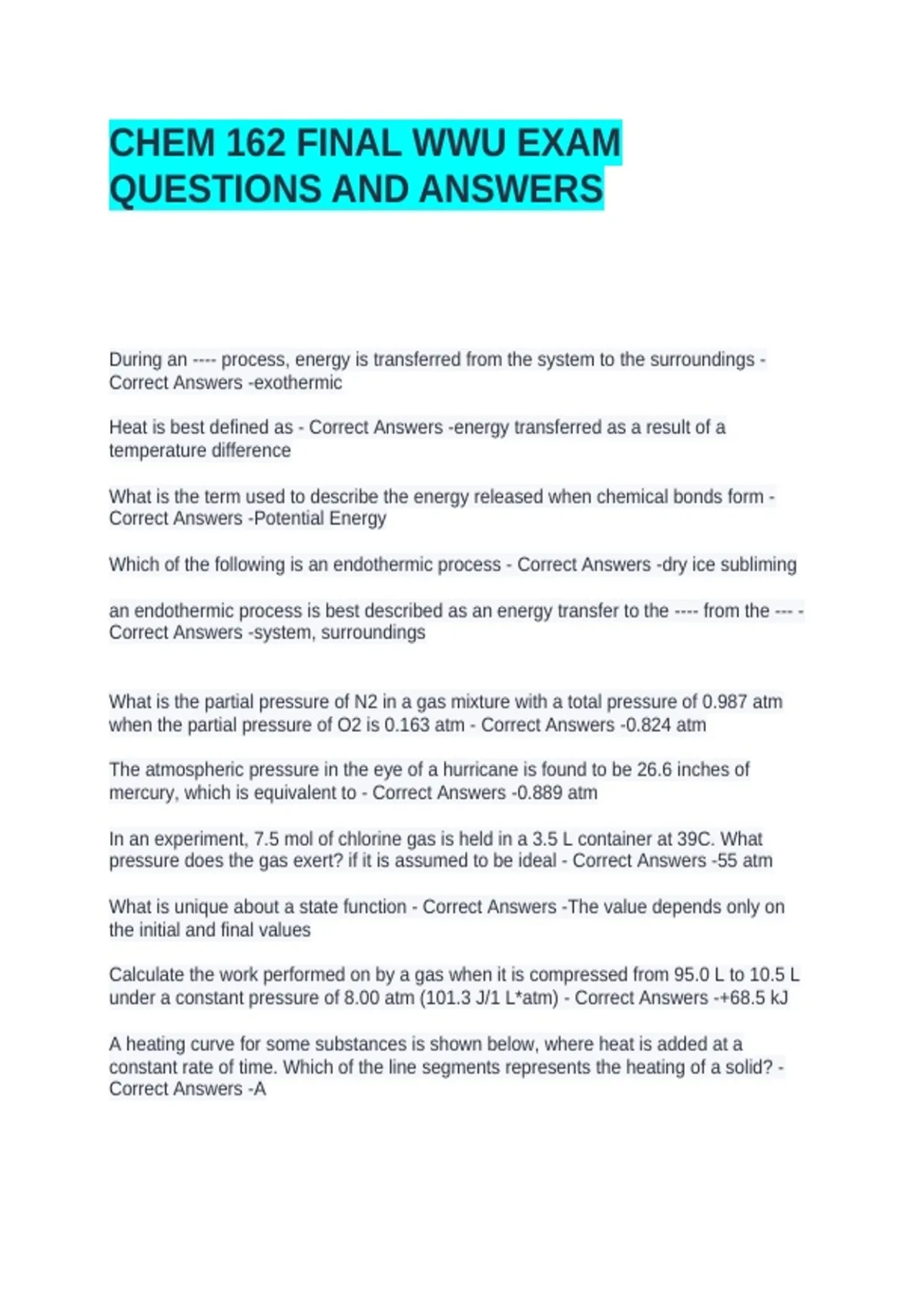 CHEM 162 FINAL WWU EXAM QUESTIONS AND ANSWERS