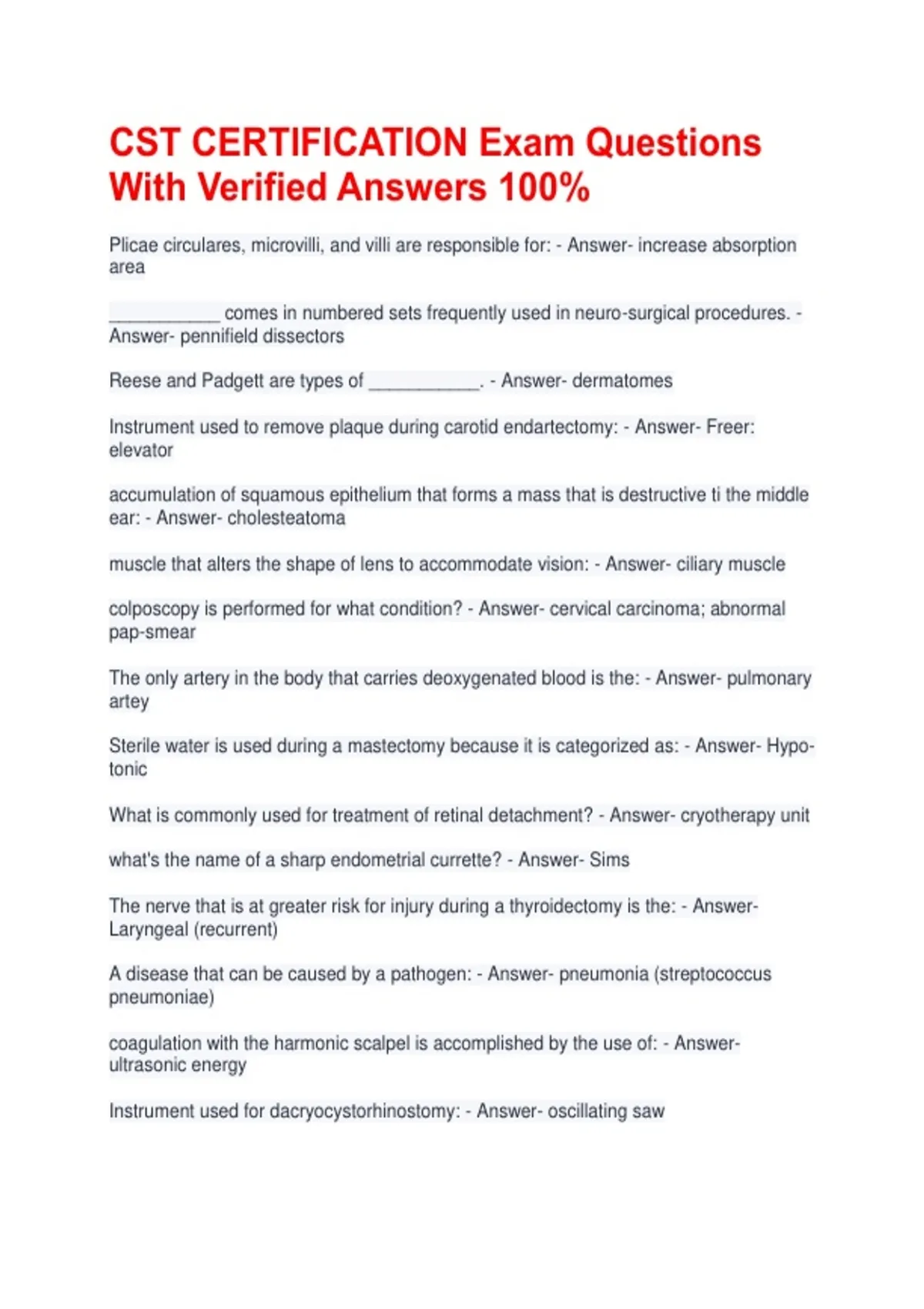 CST CERTIFICATION Exam Questions With Verified Answers 100% Plicae circulares, microvilli, and villi are responsible for: - Answer- increase absorption area ___________ comes in numbered sets frequently used in neuro-surgical procedures. - Answer- pennifield dissectors Reese and Padgett are types of ___________. - Answer- dermatomes Instrument used to remove plaque during carotid endartectomy: - Answer- Freer: elevator accumulation of squamous epithelium that forms a mass that is destructive ti the middle ear: - Answer- cholesteatoma muscle that alters the shape of lens to accommodate vision: - Answer- ciliary muscle colposcopy is performed for what condition? - Answer- cervical carcinoma; abnormal pap-smear The only artery in the body that carries deoxygenated blood is the: - Answer- pulmonary artey Sterile water is used during a mastectomy because it is categorized as: - Answer- Hypo-tonic What is commonly used for treatment of retinal detachment? - Answer- cryotherapy unit what's the name of a sharp endometrial currette? - Answer- Sims The nerve that is at greater risk for injury during a thyroidectomy is the: - Answer- Laryngeal (recurrent) A disease that can be caused by a pathogen: - Answer- pneumonia (streptococcus pneumoniae) coagulation with the harmonic scalpel is accomplished by the use of: - Answer- ultrasonic energy Instrument used for dacryocystorhinostomy: - Answer- oscillating saw Procedure that involves moving the ulnar nerve from one location to another: - Answer- Transposition When opening sterile supplies and instruments, where should the surgical technologist gown and gloves be opened? - Answer- mayo stand: separate surface Middle muscular layer of the uterus is the: - Answer- myometrium How would the CDC classify a disease that is consistently present in a community? - Answer- Endemic What drug is used for anaphylatic reaction? - Answer- antihistamine Insertion of an intraaortic balloon pump is done to treat patients with a/an? - Answer- left-ventricular failure For which of the following do burr holes provide adequate exposure: - Answer- subdural hematoma The venous sinus at the junction of the sclera and cornea is the: - Answer- canal of Schlemm Cardiac drug that increases myocardial contractility? - Answer- calcium cholride Abnormal excessive development of male breast? - Answer- Gynecomastia Incision that divides the linea alba? - Answer- vertical mid-line Which of the following is one of the 4 defects involoved in tetrology of fallot? - Answer- right ventricular hypertrophy What is used to instill contrast media into the biliary system intraoperativley? - Answer- cholangiocath funnel shaped distal opening of the fallopian tube is the: - Answer- infundibulum which organ is responsible for the synthesis of many of the coagulation factors: - Answer- liver The acronym "MAC" denotes what type of anesthesia care: - Answer- Monitored Anesthesia Care Sterile dressing materials should be opened onto the sterile back table by the: - Answer- circulator Uneven curvature of the cornea: - Answer- myopia