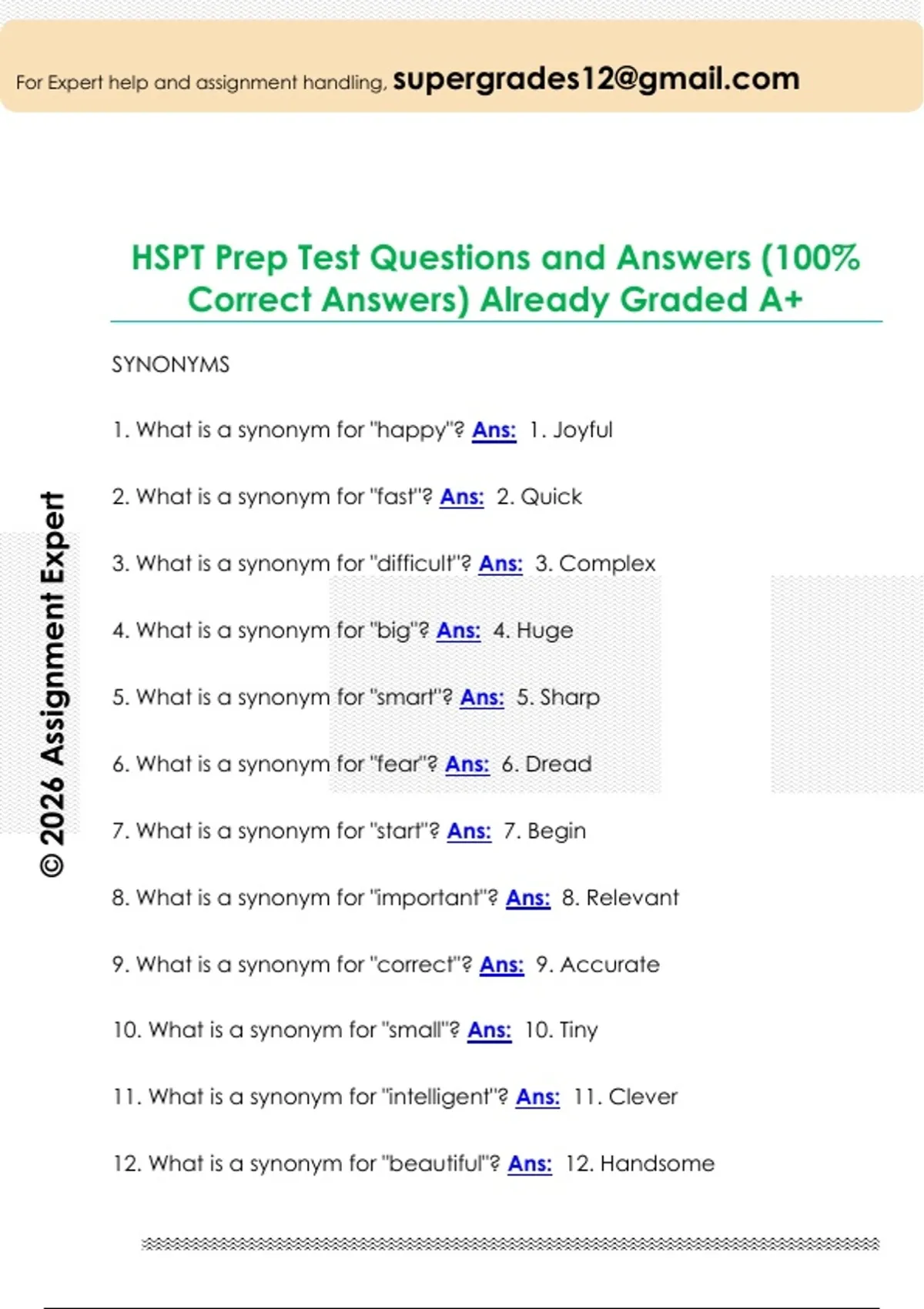 HSPT Prep Test Questions and Answers (100%