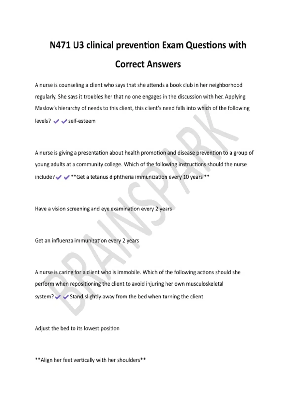 Master your nursing exams with this complete set of clinical prevention practice questions and verified answers. This resource covers essential topics such as: Maslow’s hierarchy of needs in client counseling Health promotion & disease prevention strategies (WHO definition, immunizations, screenings) Safe client repositioning & musculoskeletal protection Dimensions of wellness & Transtheoretical Model stages Substance abuse effects & prevention levels (primary, secondary, tertiary) Real‑world scenarios on cardiac rehab, stress management, and BP screening Each question includes the correct answer highlighted, making it easy to study smarter and focus on what matters most. Perfect for nursing students preparing for N471 exams, NCLEX review, or clinical prevention coursework.