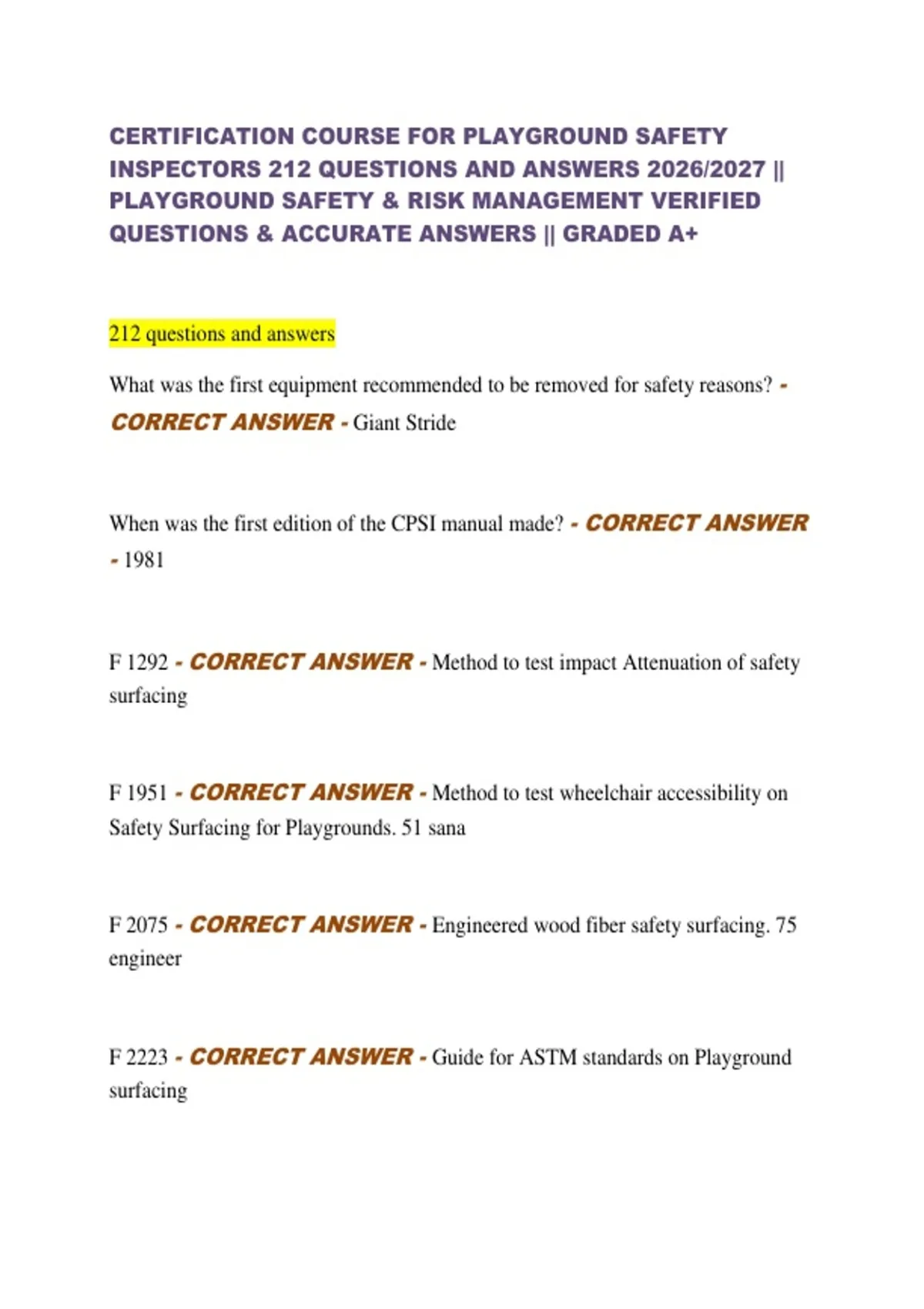CERTIFICATION COURSE FOR PLAYGROUND SAFETY INSPECTORS 212 QUESTIONS AND ANSWERS 2026/2027 || PLAYGROUND SAFETY & RISK MANAGEMENT VERIFIED QUESTIONS & ACCURATE ANSWERS || GRADED A+