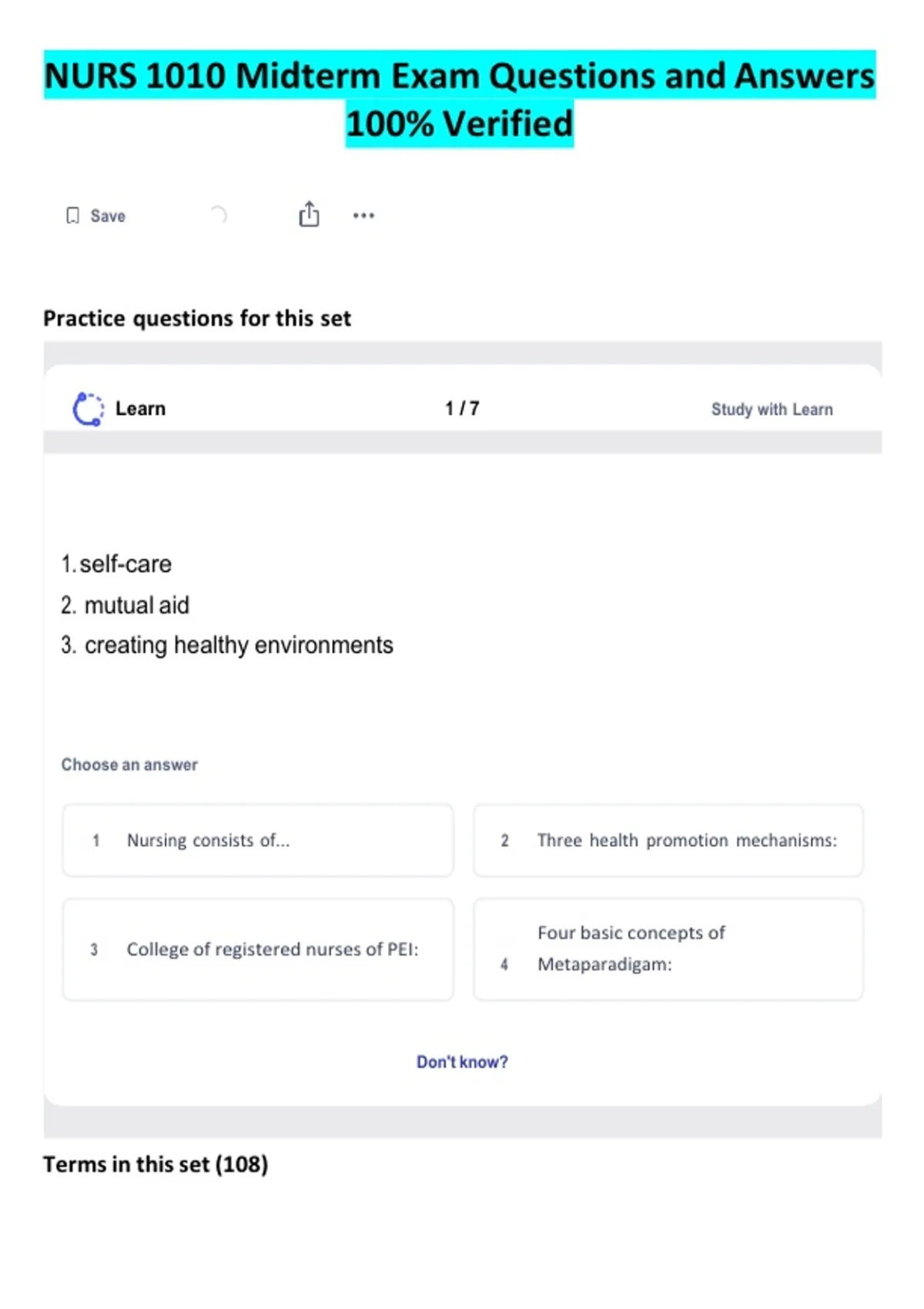 NURS 1010 Midterm Exam Questions and Answers 100% Verified