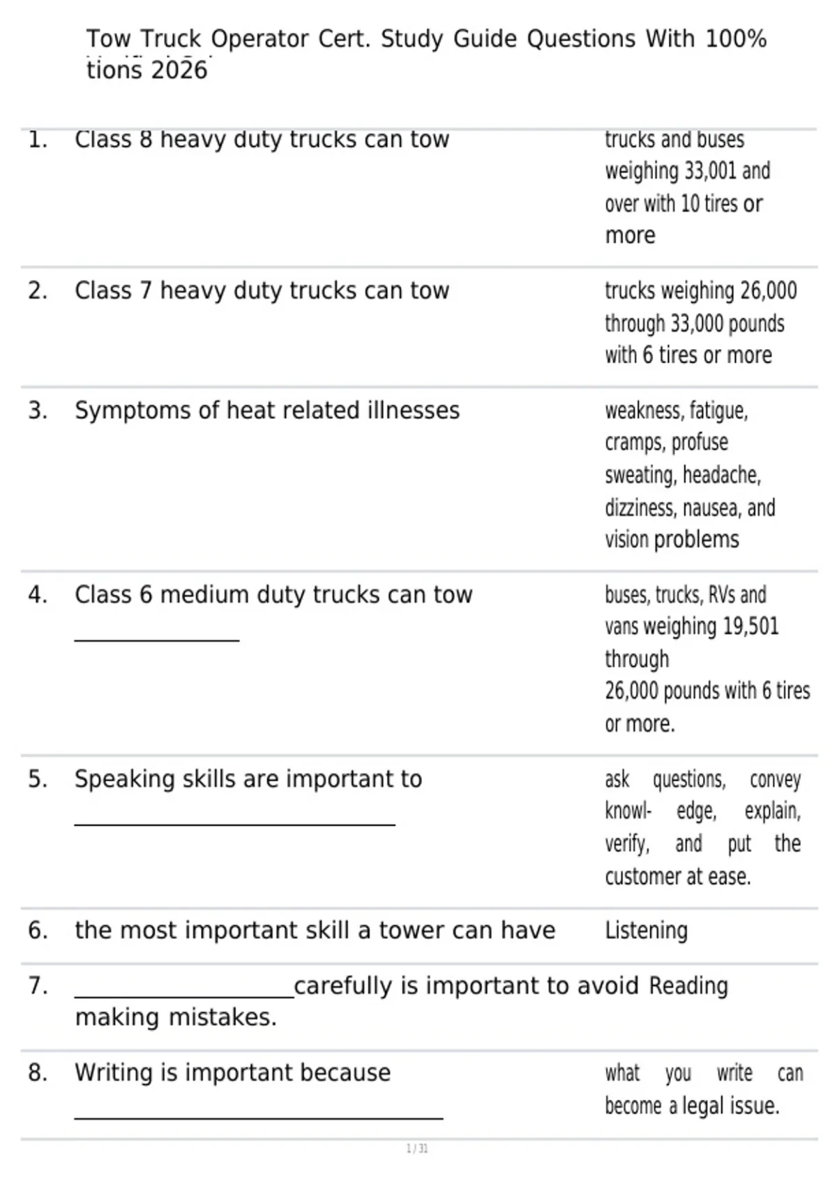 , Tow Truck Operator Cert. Study Guide Questions With 100%