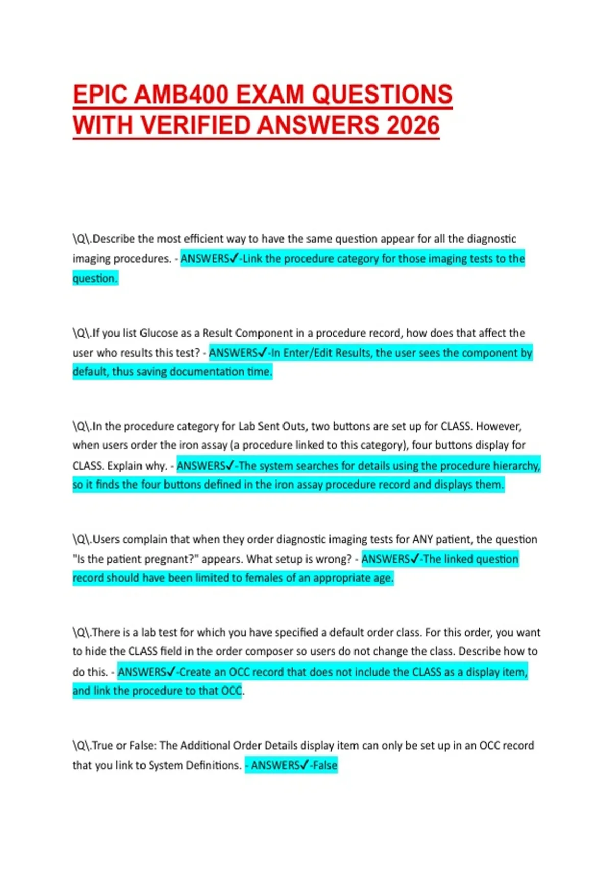 EPIC AMB400 EXAM QUESTIONS WITH VERIFIED ANSWERS 2026 Q.Describe the most efficient way to have the same question appear for all the diagnostic imaging procedures. - ANSWERS-Link the procedure category for those imaging tests to the question. Q.If you list Glucose as a Result Component in a procedure record, how does that affect the user who results this test? - ANSWERS-In Enter/Edit Results, the user sees the component by default, thus saving documentation time. Q.In the procedure category for Lab Sent Outs, two buttons are set up for CLASS. However, when users order the iron assay (a procedure linked to this category), four buttons display for CLASS. Explain why. - ANSWERS-The system searches for details using the procedure hierarchy, so it finds the four buttons defined in the iron assay procedure record and displays them. Q.Users complain that when they order diagnostic imaging tests for ANY patient, the question "Is the patient pregnant?" appears. What setup is wrong? - ANSWERS-The linked question record should have been limited to females of an appropriate age. Q.There is a lab test for which you have specified a default order class. For this order, you want to hide the CLASS field in the order composer so users do not change the class. Describe how to do this. - ANSWERS-Create an OCC record that does not include the CLASS as a display item, and link the procedure to that OCC. Q.True or False: The Additional Order Details display item can only be set up in an OCC record that you link to System Definitions. - ANSWERS-False Q.What context is OCC? - ANSWERS-Ambulatory Context Q.What is Controlled? - ANSWERS-Term to specify if field should be required or recommended. Q.What else can meds and procedures contain? - ANSWERS-Instructions, questions (LQL), add'l items Q.What is EAP? - ANSWERS-Procedures Q.Orderable procedures must be linked to what in order for them to be looked up in order entry? - ANSWERS-Procedure Category Q.What is determined in the procedure/ procedure category? - ANSWERS-Buttons, default order status, default order class, what should be available. Q.Where are the buttons entered in a procedure/procedure category? - ANSWERS-Outpatient order composer buttons selection screen Q.What and where determines what order classes are available? - ANSWERS-Procedure/procedure category and under 'Allowed Order Class Section' Q.What procedure name is seen by end users? - ANSWERS-Order Display Name Q.Where can free text fields be added to orders? - ANSWERS-OCC Q.LQL Questions- what should be entered for free text? - ANSWERS-Response type: Text Q.If questions are linked to a procedure and its category, what happens? - ANSWERS-Both sets of questions appear (even one question more than once) from both levels Q.If questions should only not be displayed from both the procedure and the procedure category, what can be done? - ANSWERS-This can be overridden so that only procedure-level questions display. Q.What are primary display items? - ANSWERS-OCC Procedure details Q.What are secondary display items? - ANSWERS-Show Add'l details Q.Order class buttons and the default order class are chosen from what section? - ANSWERS-"Allowed order classes" Q.True or False: If a value has not been listed as allowed, this cannot be listed as a button or default value? - ANSWERS-True Q.Procedure Category Setup for OCC - ANSWERS-Ambulatory context -> Your AMB POCT Orderables OCC Additional Outpatient Order Details Context -> AMB Point of Care Additional Order Details Q.Procedures Link to a Result Component are listed as what? - ANSWERS-Orderable and Performable