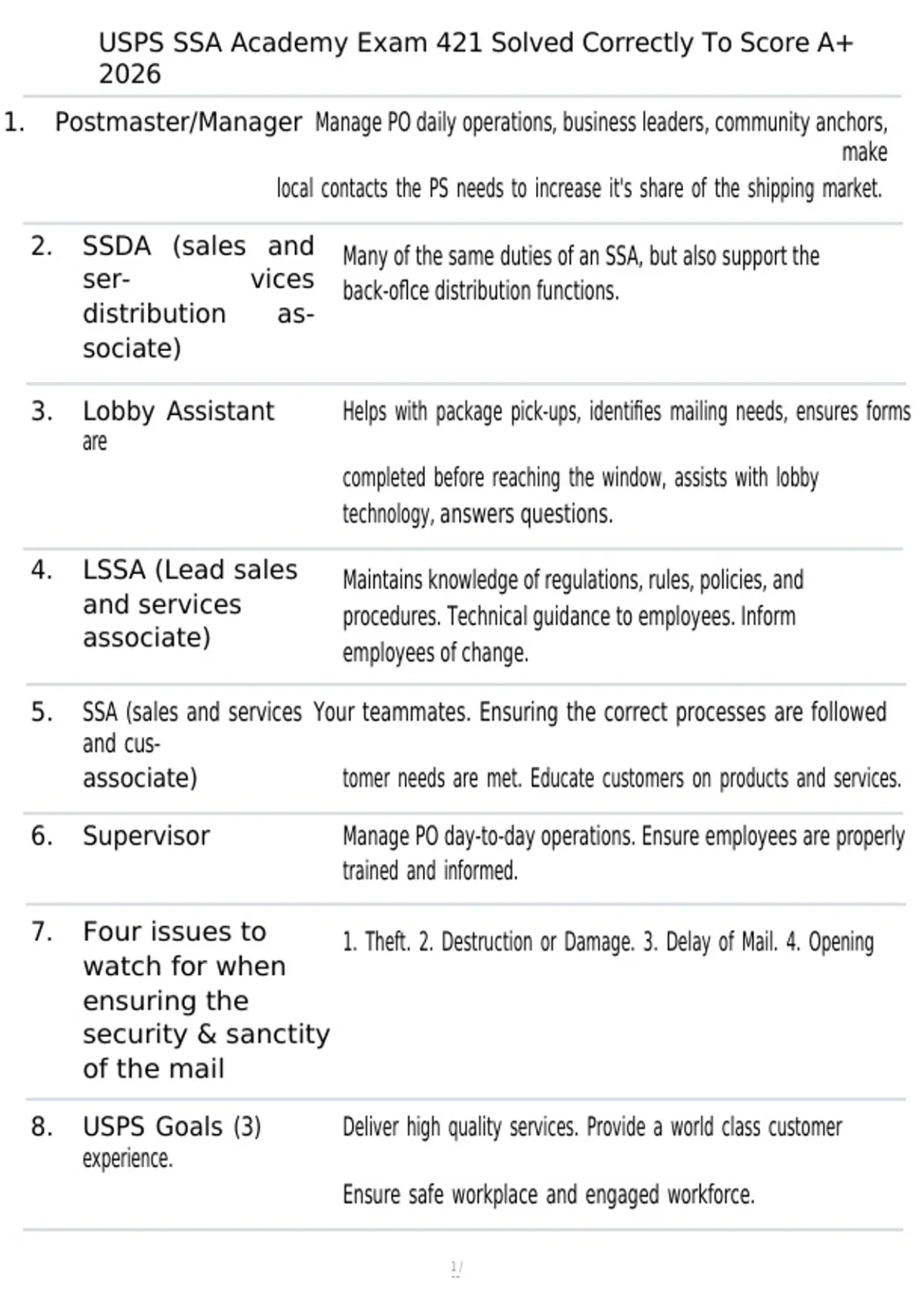 , USPS SSA Academy Exam 421 Solved Correctly To Score A+