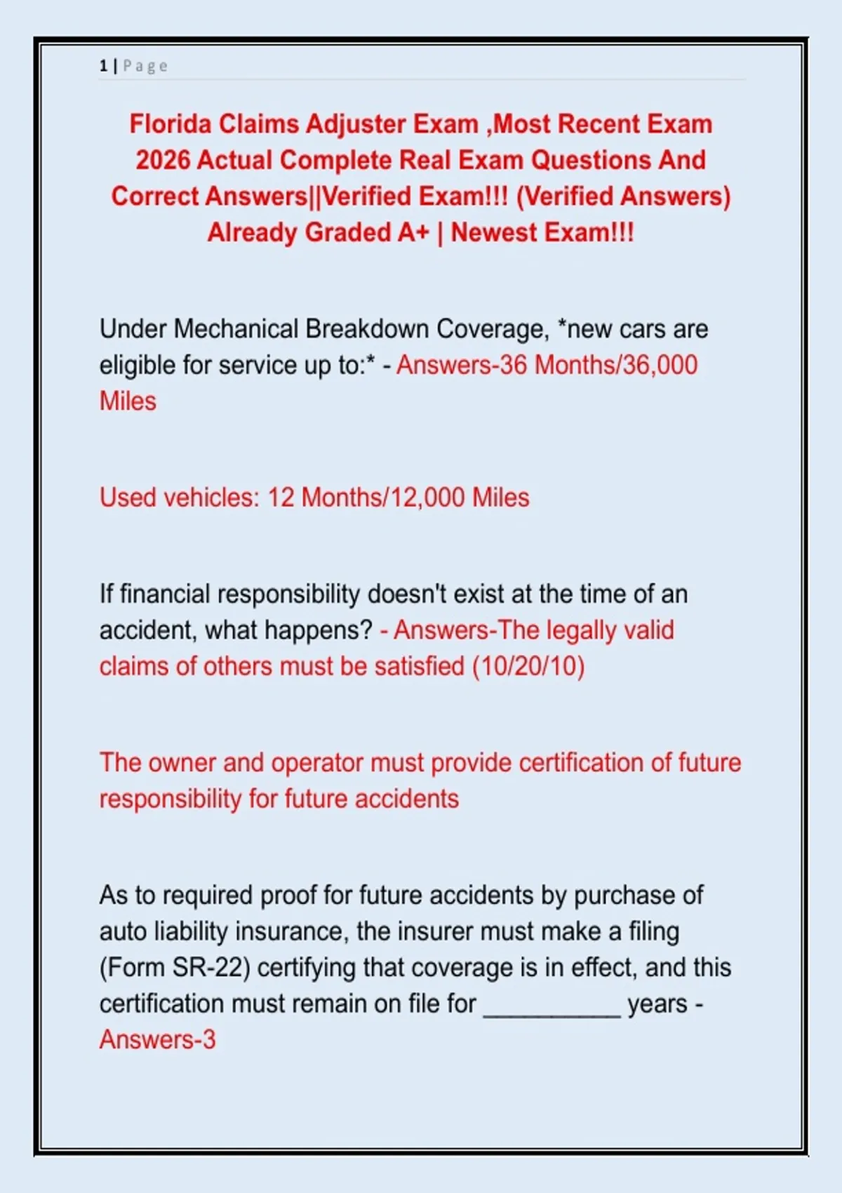 Florida Claims Adjuster Exam ,Most Recent Exam 2026 Actual Complete Real Exam Questions And Correct Answers||Verified Exam!!! (Verified Answers) Already Graded A+ | Newest Exam!!!