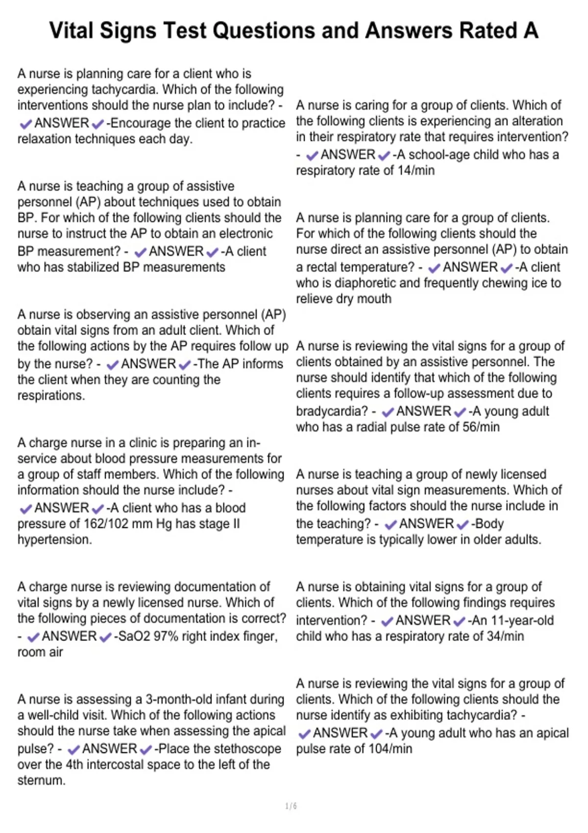 , Vital Signs Test Questions and Answers Rated A