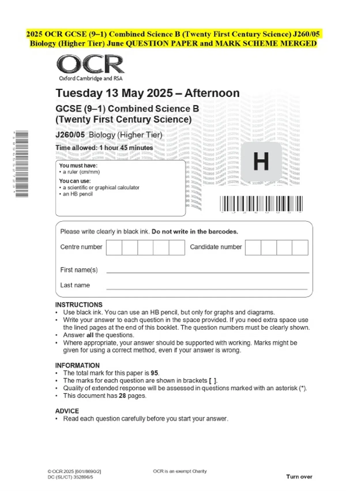 2025 OCR GCSE (9–1) Combined Science B (Twenty First Century Science) J260/05 Biology (Higher Tier) June QUESTION PAPER and MARK SCHEME MERGED
