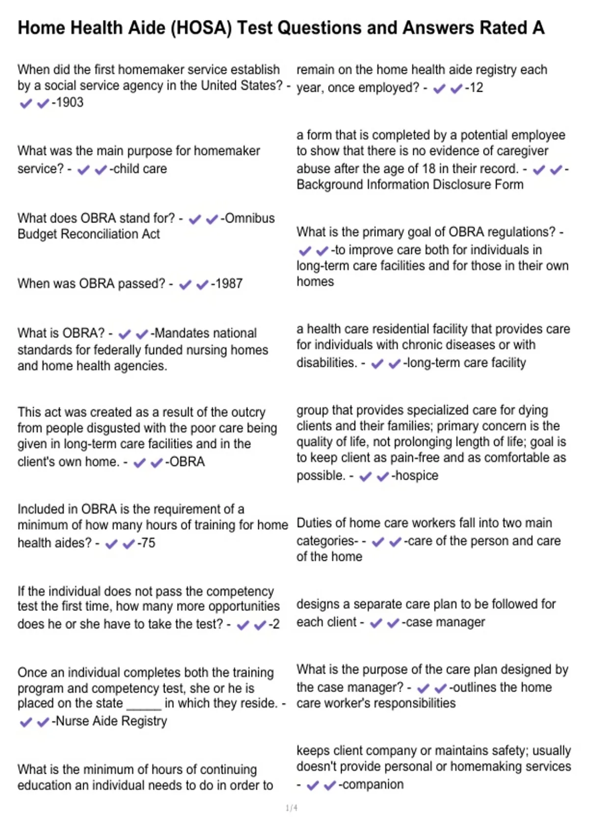 Home Health Aide (HOSA) Test Questions and Answers Rated A