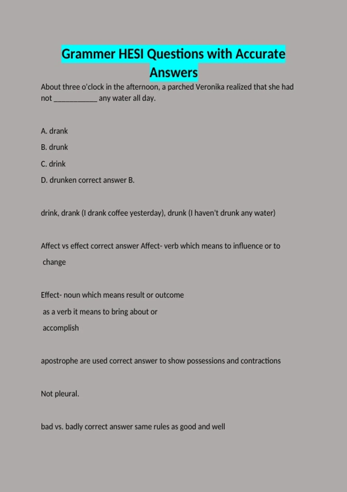 About three o'clock in the afternoon, a parched Veronika realized that she had not ___________ any water all day. A. drank B. drunk C. drink D. drunken correct answer B. drink, drank (I drank coffee yesterday), drunk (I haven't drunk any water) Affect vs effect correct answer Affect- verb which means to influence or to change Effect- noun which means result or outcome as a verb it means to bring about or accomplish apostrophe are used correct answer to show possessions and contractions Not pleural. bad vs. badly correct answer same rules as good and well