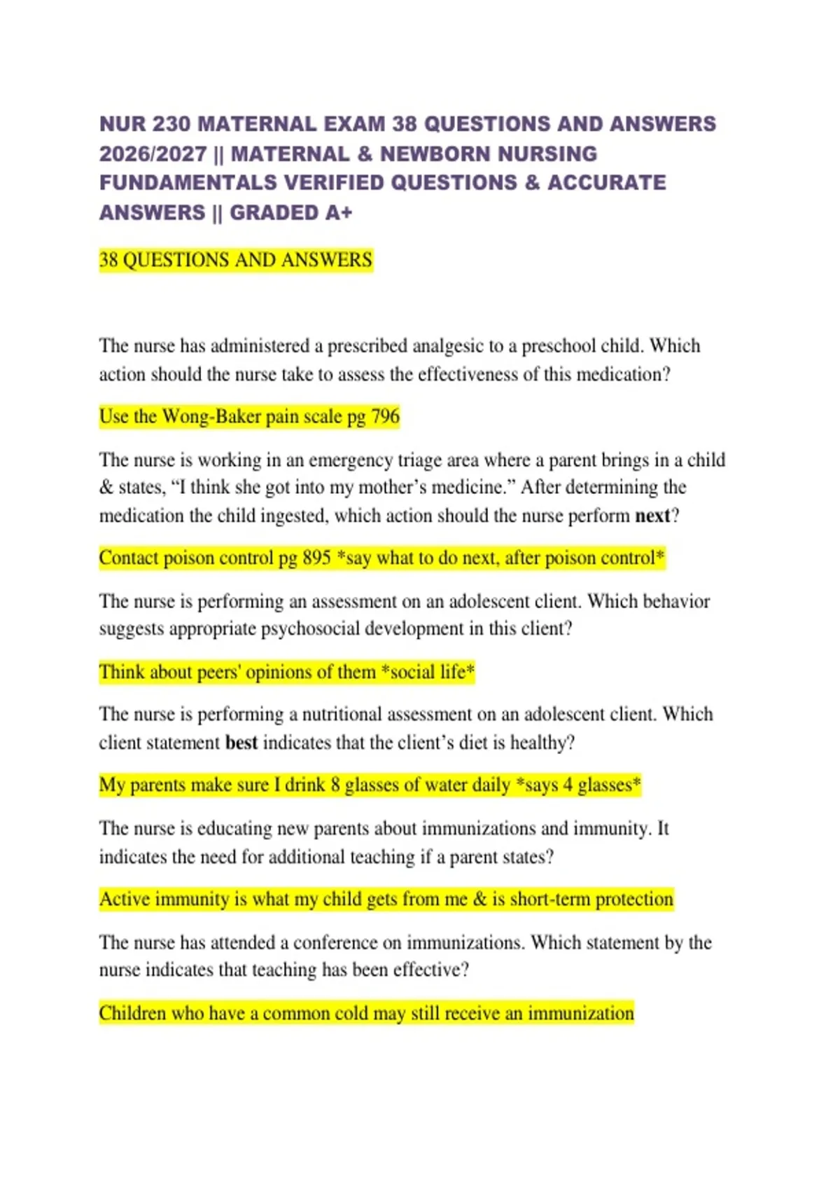 NUR 230 MATERNAL EXAM 38 QUESTIONS AND ANSWERS 2026/2027 || MATERNAL & NEWBORN NURSING FUNDAMENTALS VERIFIED QUESTIONS & ACCURATE ANSWERS || GRADED A+
