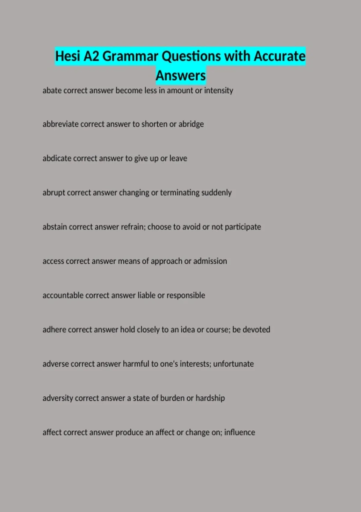 abate correct answer become less in amount or intensity abbreviate correct answer to shorten or abridge abdicate correct answer to give up or leave abrupt correct answer changing or terminating suddenly abstain correct answer refrain; choose to avoid or not participate access correct answer means of approach or admission accountable correct answer liable or responsible adhere correct answer hold closely to an idea or course; be devoted adverse correct answer harmful to one's interests; unfortunate adversity correct answer a state of burden or hardship affect correct answer produce an affect or change on; influence