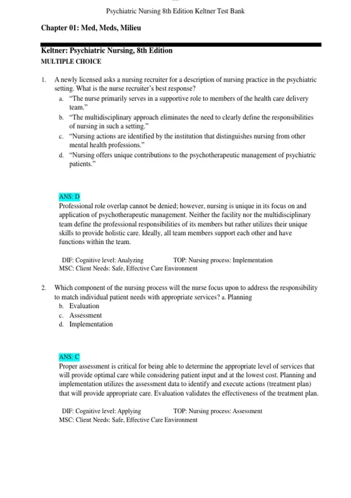 Psychiatric Nursing 8th Edition Keltner Test Bank