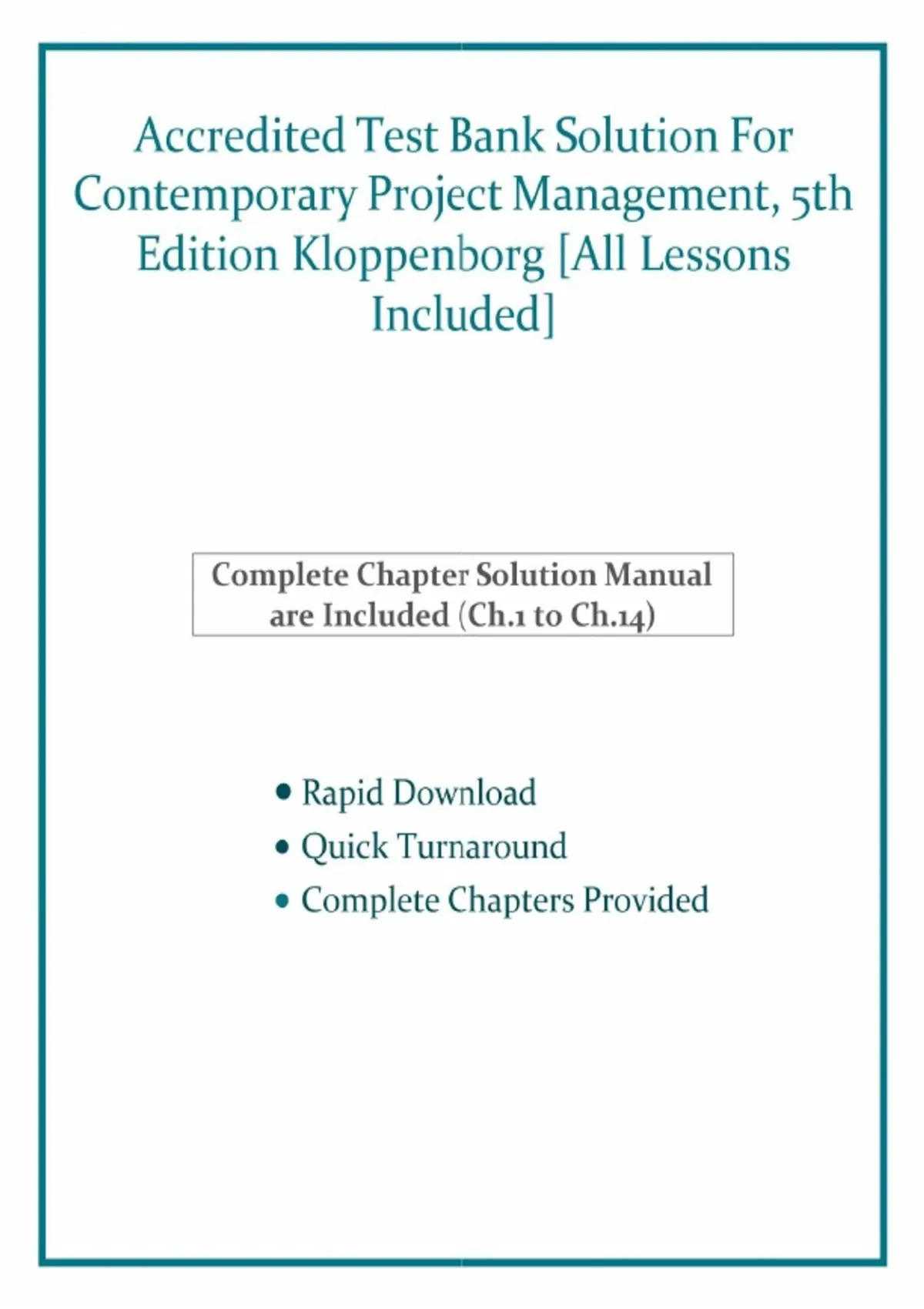 Contemporary Project Management, 5th Edition by Kloppenborg | Accredited Test Bank & Complete Solution Manual (Ch.1–14) | Updated 2025/2026 | Rapid Download