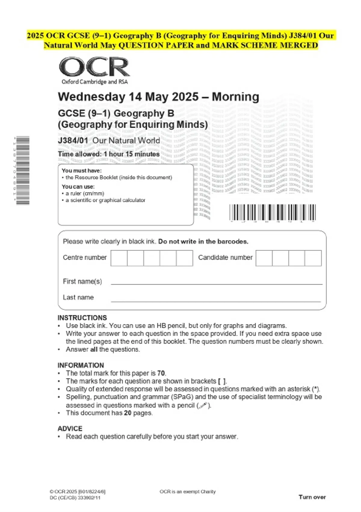 2025 OCR GCSE (9–1) Geography B (Geography for Enquiring Minds) J384/01 Our Natural World May QUESTION PAPER and MARK SCHEME MERGED