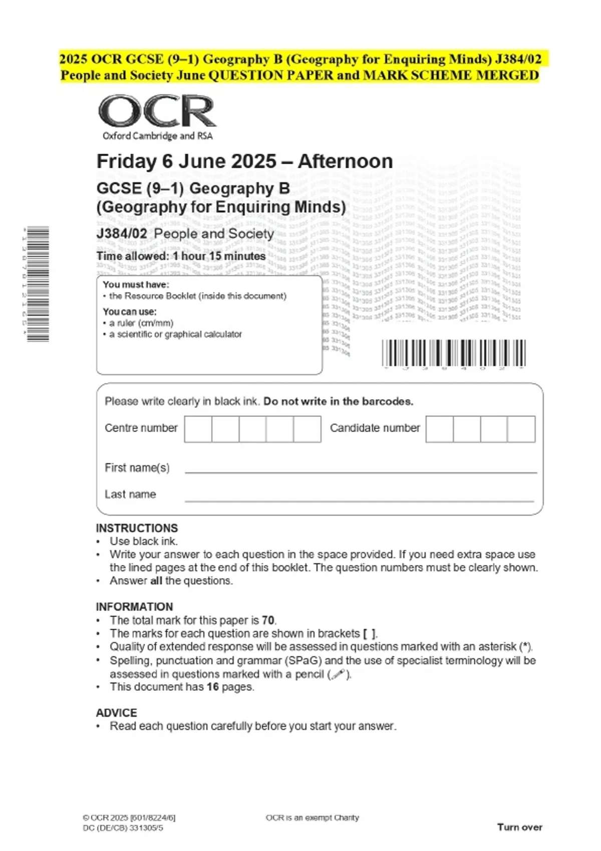 2025 OCR GCSE (9–1) Geography B (Geography for Enquiring Minds) J384/02 People and Society June QUESTION PAPER and MARK SCHEME MERGED