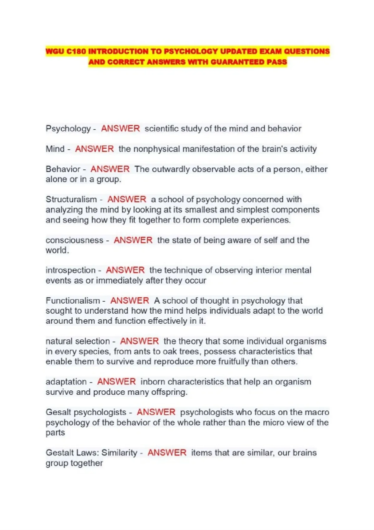 WGU C180 INTRODUCTION TO PSYCHOLOGY UPDATED EXAM QUESTIONS AND CORRECT ANSWERS WITH GUARANTEED PASS