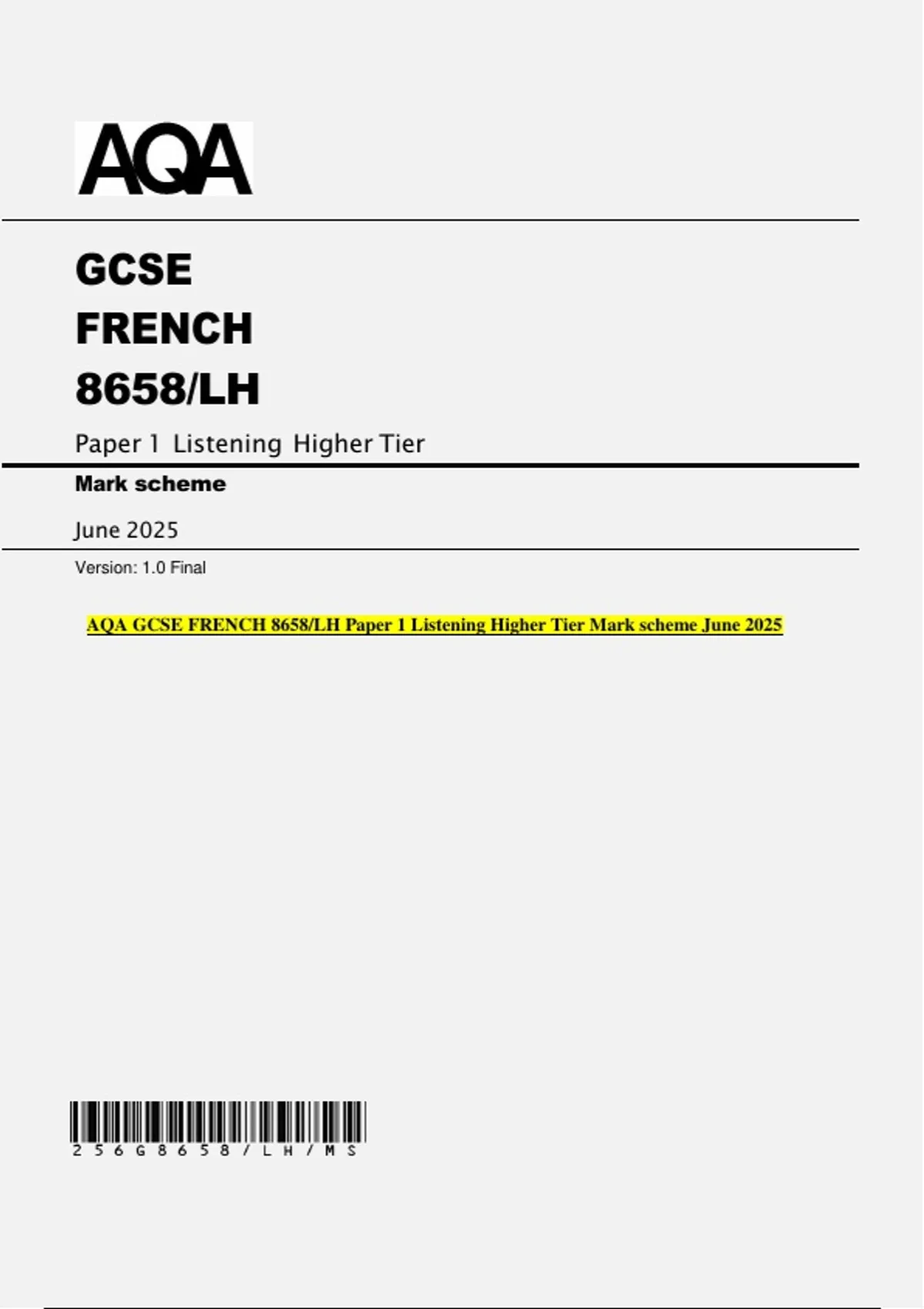 AQA GCSE FRENCH 8658/LH Paper 1 Listening Higher Tier Mark scheme June 2025
