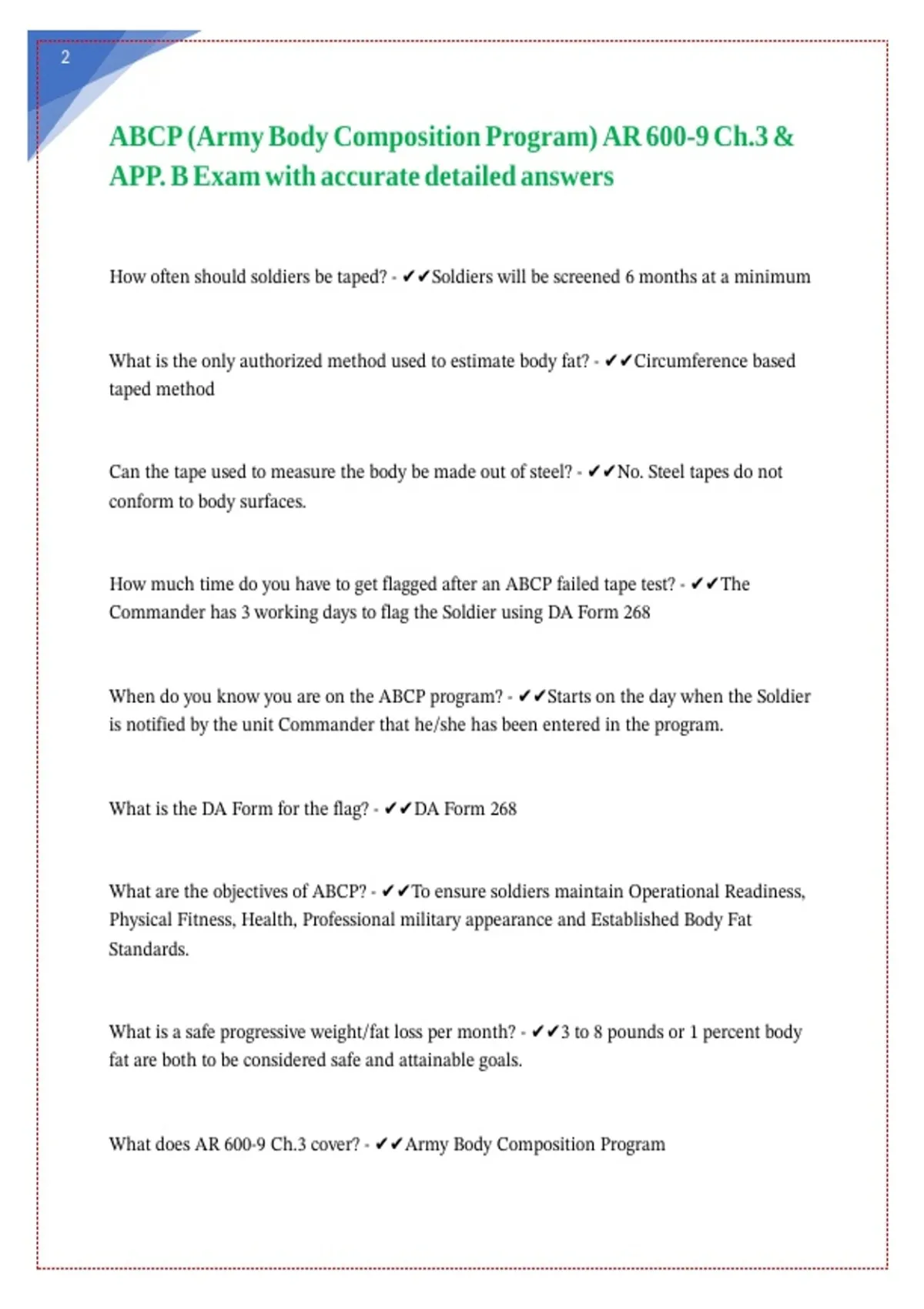 ABCP (Army Body Composition Program) AR 600-9 Ch.3 & APP. B Exam with accurate detailed answers