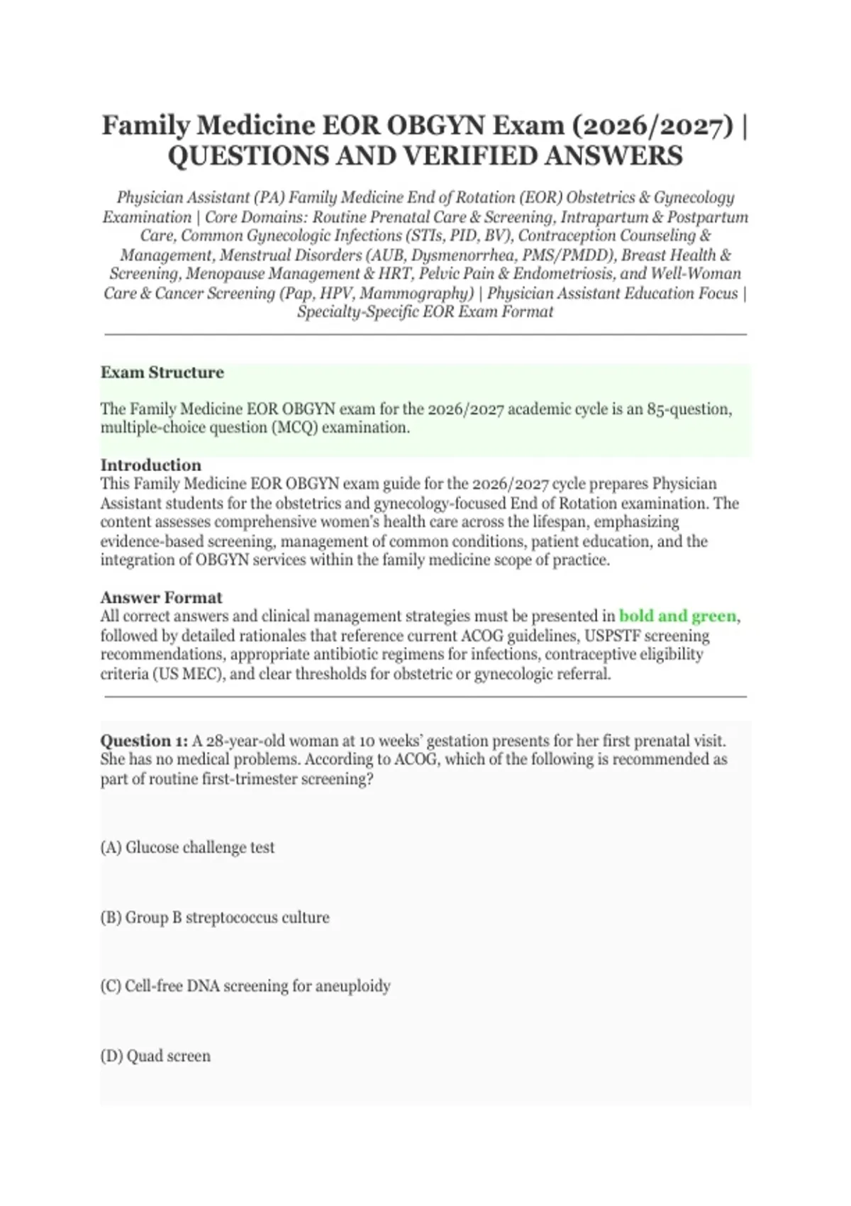 This document provides comprehensive preparation for the Physician Assistant (PA) Family Medicine End of Rotation (EOR) Obstetrics & Gynecology Examination, featuring complete questions with verified answers for the 2026/2027 academic cycle. It covers routine prenatal care and screening protocols, intrapartum and postpartum care management, common gynecologic infections (STIs, PID, BV), contraception counseling and management strategies, menstrual disorders (AUB, dysmenorrhea, PMS/PMDD), breast health and screening guidelines, menopause management and HRT considerations, pelvic pain and endometriosis evaluation, and well-woman care with cancer screening (Pap, HPV, mammography) according to current NCCPA blueprint standards and physician assistant education requirements. This essential tool offers authentic EOR exam simulation and systematic content review to ensure mastery of OBGYN principles and success on your family medicine rotation assessment.