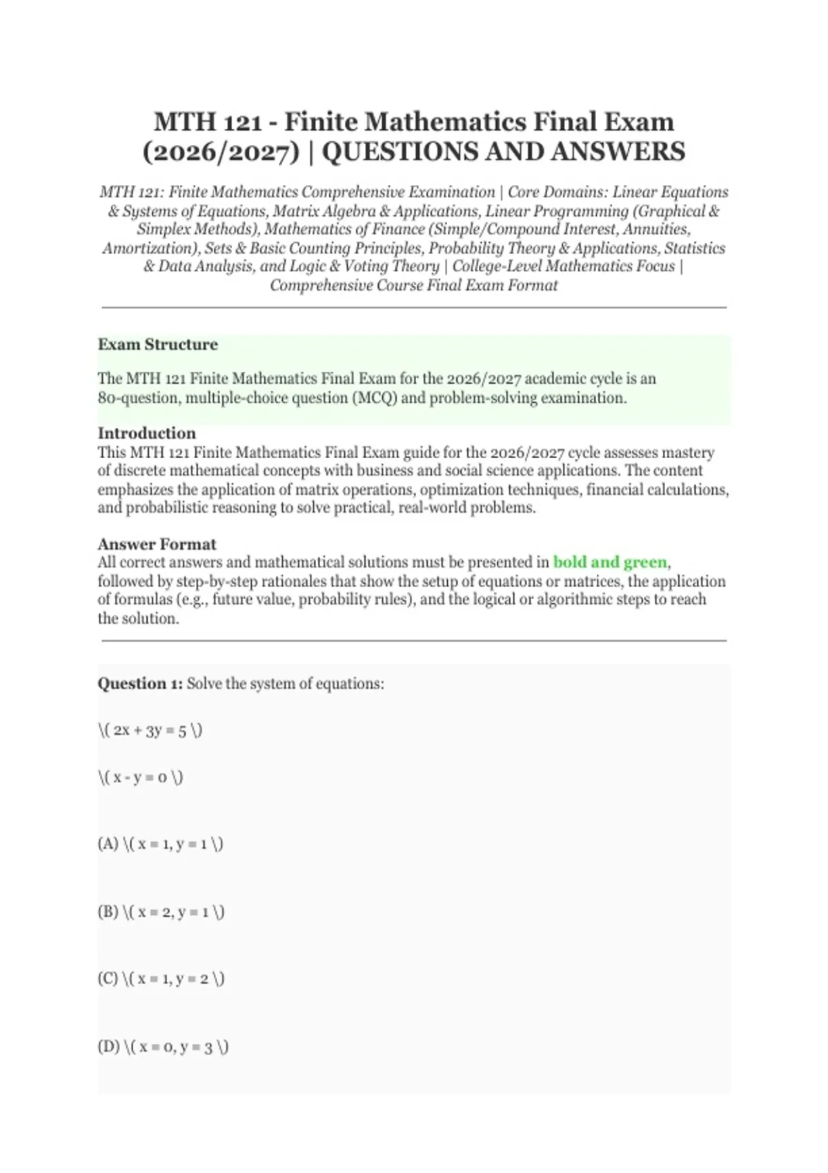 MTH 121: Finite Mathematics Comprehensive Examination | Core Domains: Linear Equations