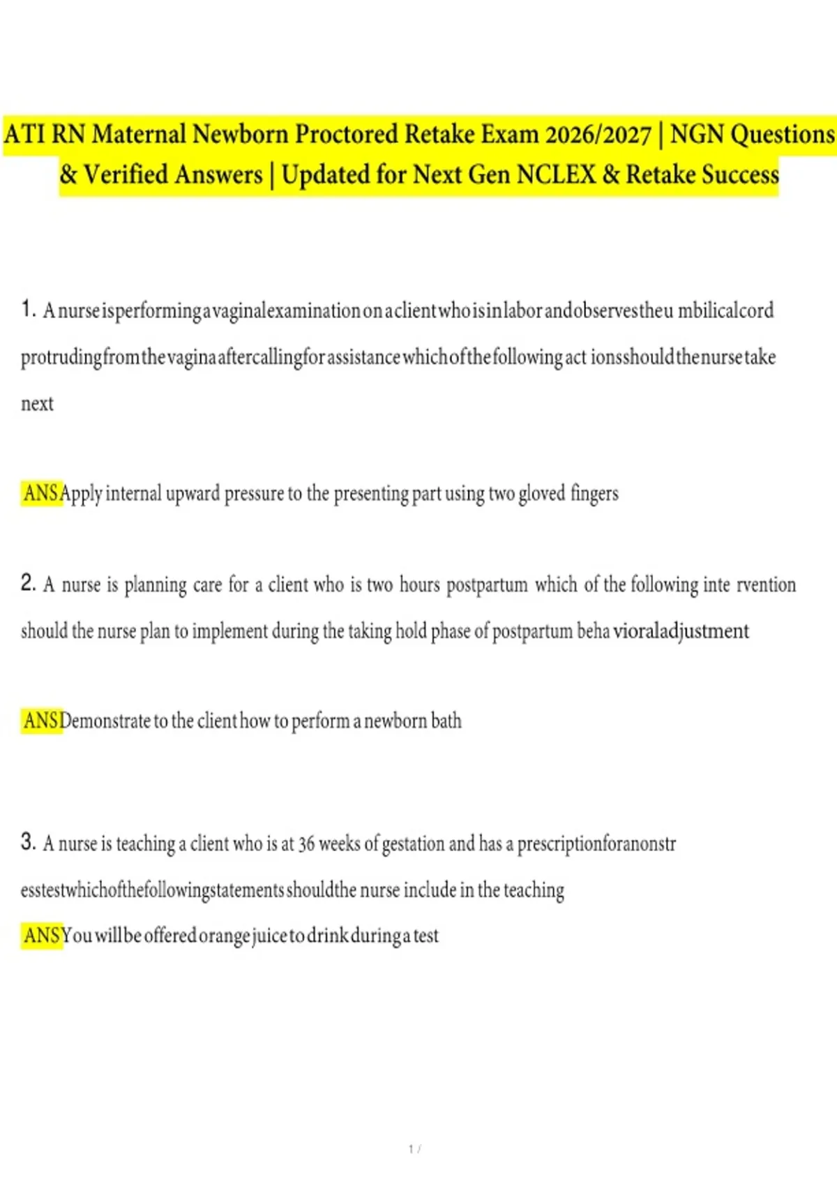 2026/2027 Updated Resource: Specifically designed for the ATI RN Maternal Newborn Proctored Retake Exam. This guide includes the latest NGN (Next Generation NCLEX) style questions and verified answers to ensure you pass your second attempt. Covers all critical retake topics: high-risk OB, complex labor & delivery scenarios, postpartum complications, and advanced newborn care. Features detailed rationales to build clinical judgment and avoid previous mistakes. Your targeted solution for retake success and program progression.