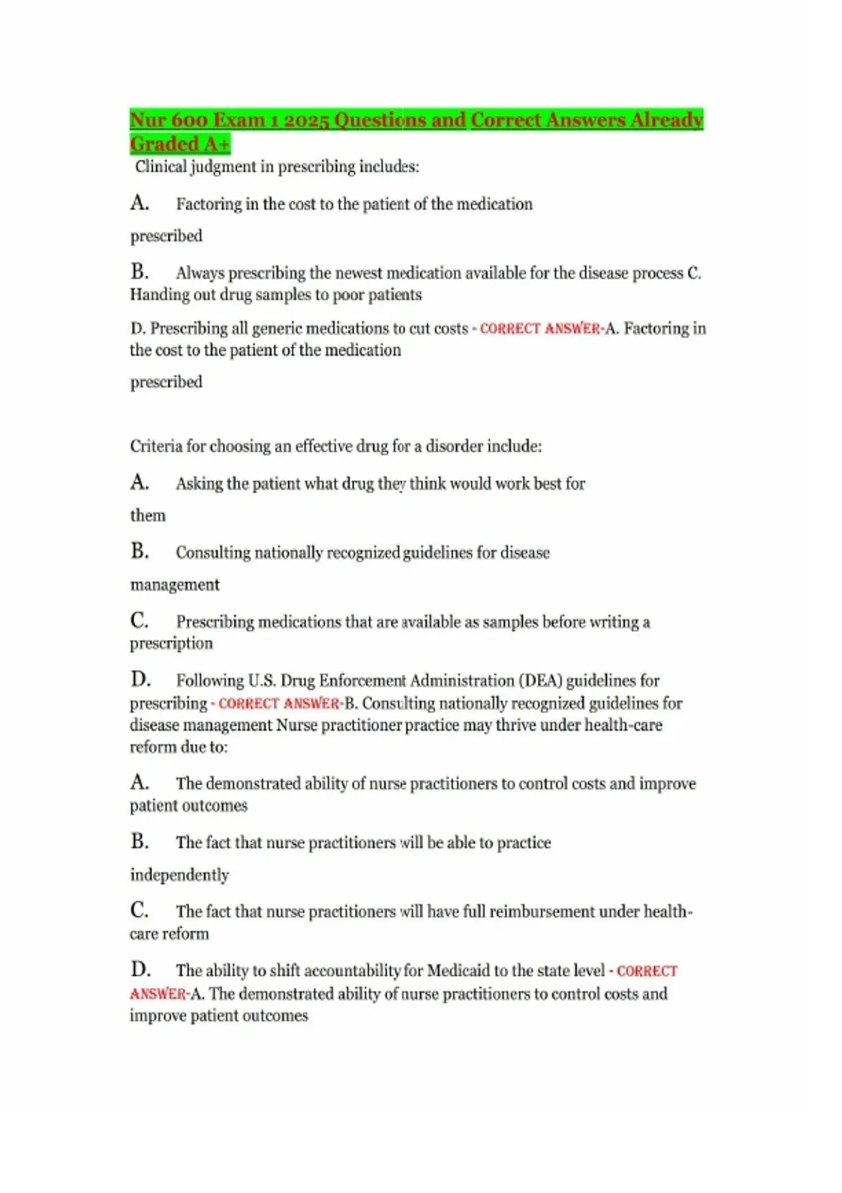 Nur 600 Exam 1 2025 Questions and Correct Answers Already Graded A+