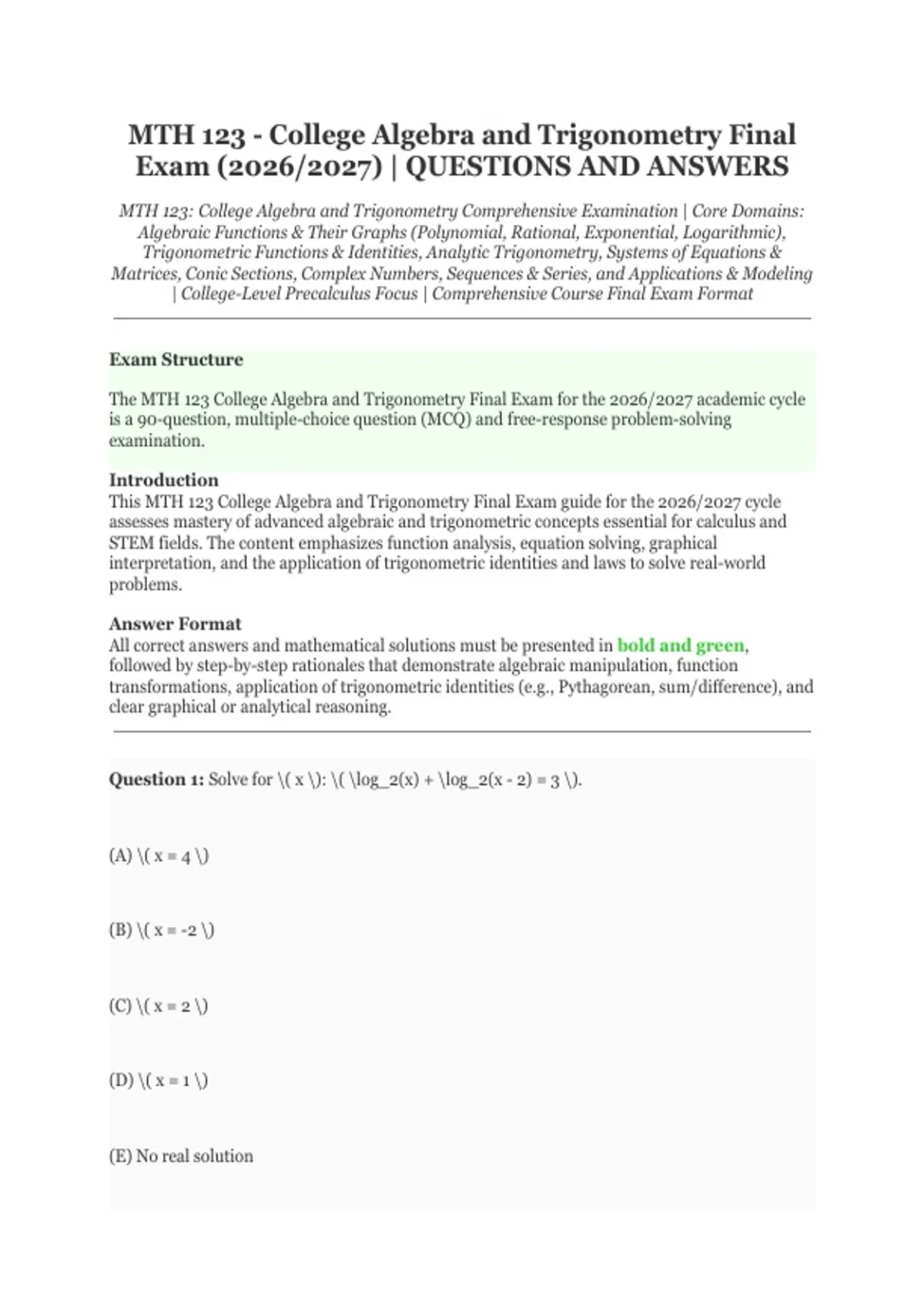 This MTH 123 College Algebra and Trigonometry Final Exam guide for the 2026/2027 cycle