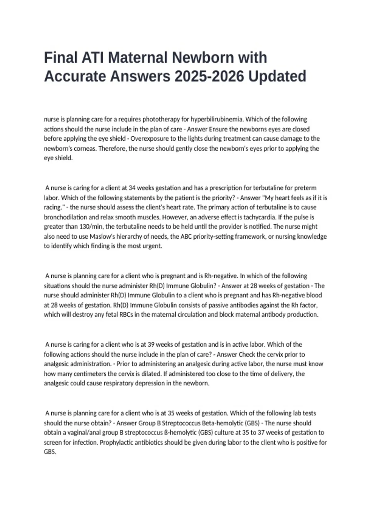Maternal newborn final exam with Answers Updated
